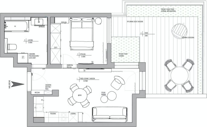 Wydzielona sypialnia zabrała z całości sporo – około 10 metrów kwadratowych, więc tam umieściliśmy główny mebel do przechowywania – wielką szafę. Całą resztę zaś mocno „skondensowaliśmy”, począwszy od kuchni, która musiała być funkcjonalna i pomieścić potrzebne AGD. W związku z tym nie pozostało wiele miejsca na blat, więc jego przedłużeniem stał się stół jadalny – wyłożony plastrem spieku kwarcowego. Można na nim kroić i przygotowywać posiłki.