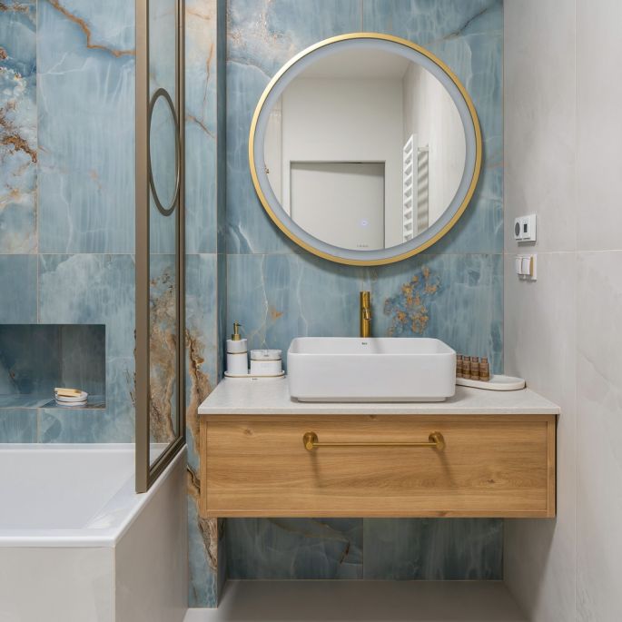 Aby nieduże mieszkanie miało spójną stylistykę, kolor błękitny pojawił się także w łazience na płytkach ceramicznych imitujących onyks.