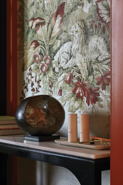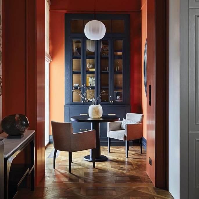 Pomarańczowy odcień czerwieni z koralowym podtonem, dominujący w tym apartamencie, to kolor, który powstał ku czci… ognistych włosów Charlotte, dyrektor kreatywnej firmy Farrow & Ball, która wymyśla kolory farb i schematy kolorystyczne dla firmy. Założyciel marki zwykł mawiać: „Farba jest jak kawa. Kolor to pianka na jej wierzchu, ale o dobrym smaku decyduje jakość całej zawartości filiżanki”. Dlatego dom pomalowany dobrą farbą jest smakowity.