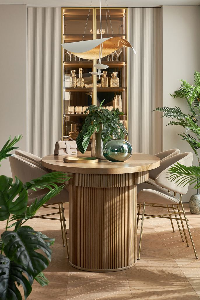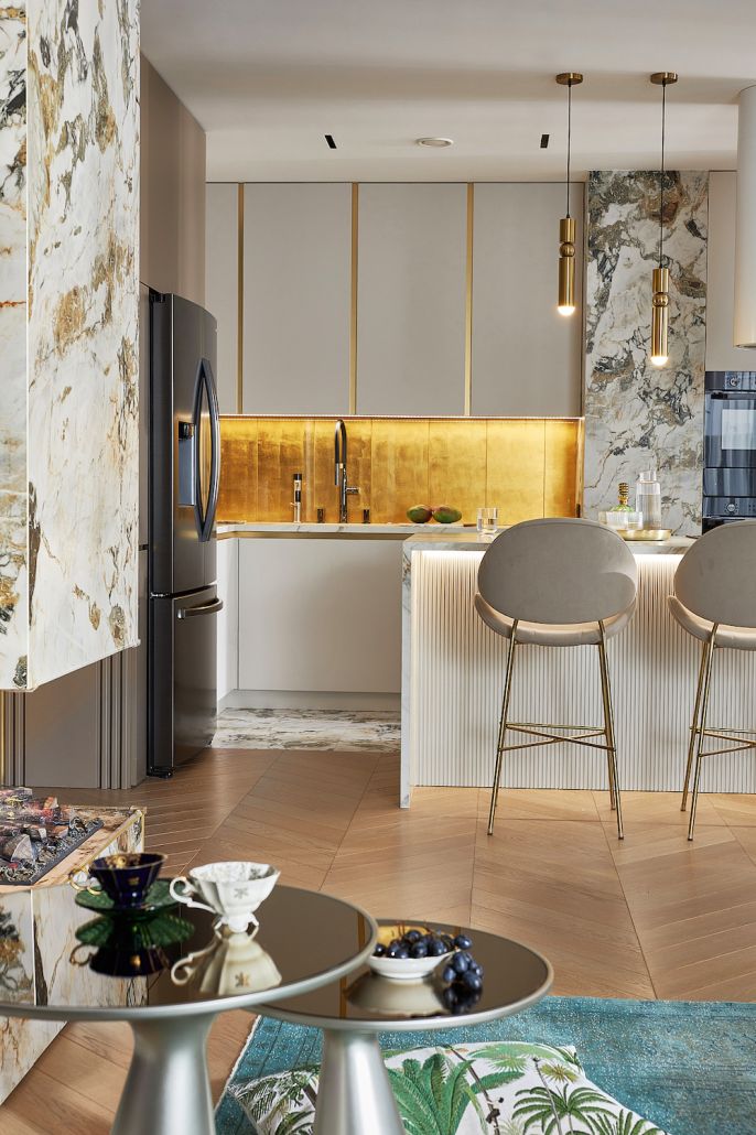 Złoto jest zdecydowanym leitmotivem tego mieszkania – od połyskujących detali wyposażenia po złocistą ścianę nad blatami kuchennymi. Ta wyłożona jest szkliwionymi płytami ceramicznymi, w których zatopiono prawdziwe płatki złota. Złociste są także lampy, z których najbardziej spektakularna jest ta wisząca nad stołem jadalnym, stworzona w słynnej włoskiej manufakturze Catellani & Smith.