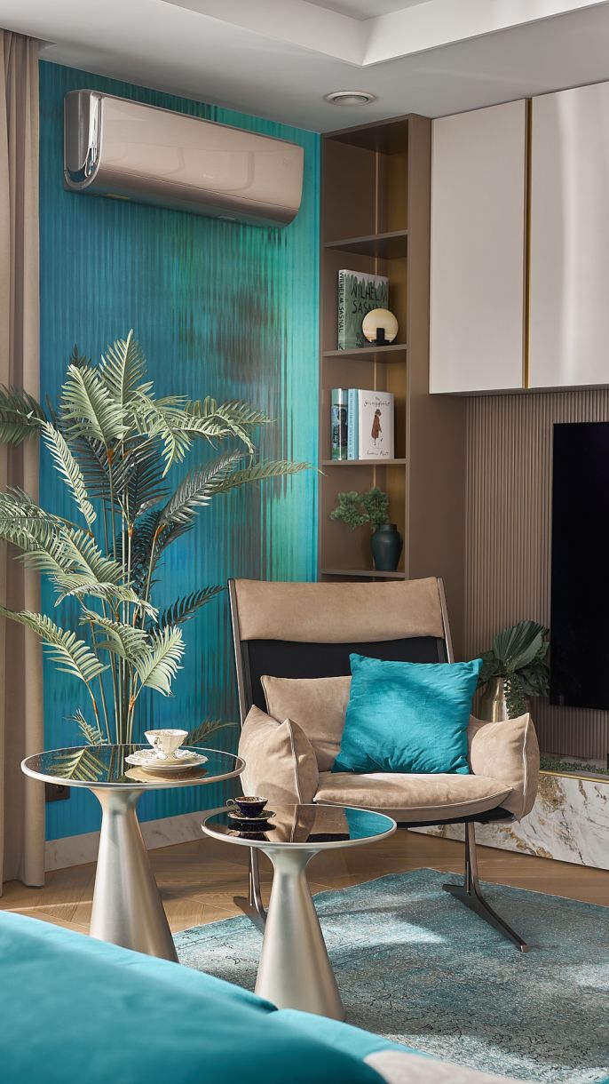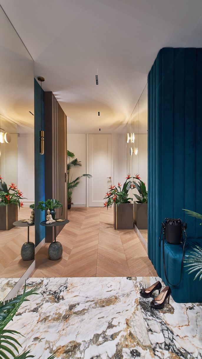 Eleganckie mieszkanie w morskiej zieleni, turkusach i złocie – to wnętrze urządzono w nowoczesnym i wytwornym stylu