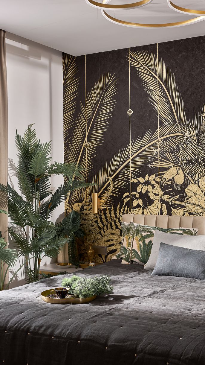 Urządzając sypialnie, Agnieszka najczęściej projektuje do nich także łóżka i tak było w tym wypadku. Pewnym osobistym rysem sypialni małżeńskiej jest tutaj dekoracyjna i efektowna tapeta z motywem palmy. – Muszę przyznać, że to jeden z moich ulubionych wzorów tapet i taki sama ma u siebie w domu – przyznaje architektka, która dla wzmocnienia całościowego efektu ozdobiła tapetą także łazienkę.