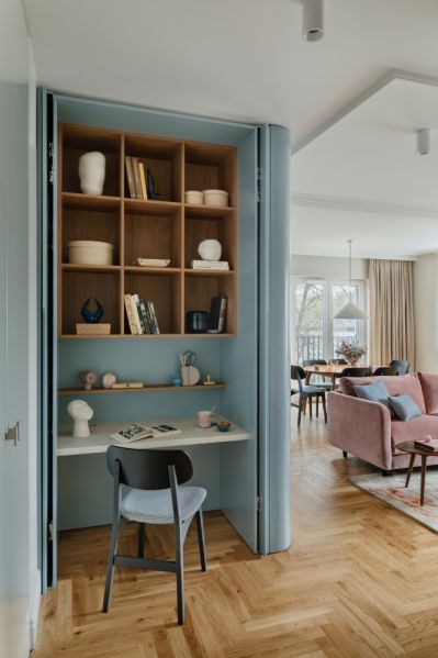 – Dla naszej klientki kluczowa była przestrzeń. Przeprowadziła się z dużego domu i zależało jej, żeby w mieszkaniu nie odczuwała aż tak dużej różnicy – mówi Hanna Pietras. – Kolejna potrzeba, która została dosyć precyzyjnie określona to przestrzeń do pracy, ale ukryta. Miejsce musiało być zamknięte, bo pojawia się w nim dużo prywatnych akcentów. Tutaj zaproponowaliśmy drzwi przesuwno-otwierane, dzięki temu w każdym momencie jednym ruchem ręki można je zasłonić – dodaje architektka.