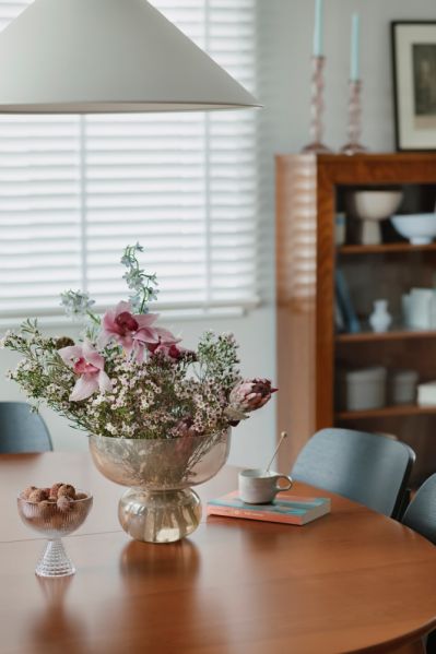 Połączenie błękitu z pudrowym różem wprowadziło do wnętrza świeżość i dużo pozytywnej energii. Co więcej, odcienie w pastelowym mieszkaniu dobrano tak, by idealnie współgrały z meblami vintage, np. komodą w salonie. Subtelne kolory stanowią piękne tło dla dodatków. Pamiątki, grafiki, kwiaty i książki to elementy, które nie tylko dekorują wnętrze, ale też oddają charakter właścicielki.