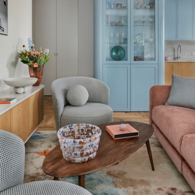 Błękit, pudrowy róż i modne obłości. To mieszkanie w pastelowych kolorach zaprojektowała pracownia Hanny Pietras