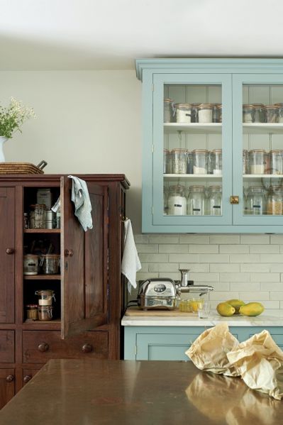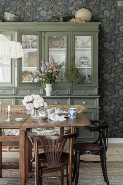 W klasycznej kuchni na wsi w roli głównej piękna tapeta z sielskim, botanicznym wzorem. Na jej tle stary kredens w kolorze oliwkowej zieleni albo rustykalne półeczki z wieszaczkami na filiżanki. Klimat w kuchni stworzą też dodatki w stylu retro – kuchenna waga, fajansowa zastawa, szklane butelki na oliwę. Na stole obowiązkowo bukiet kwiatów albo kolorowe naczynia w kształcie owoców i warzyw.