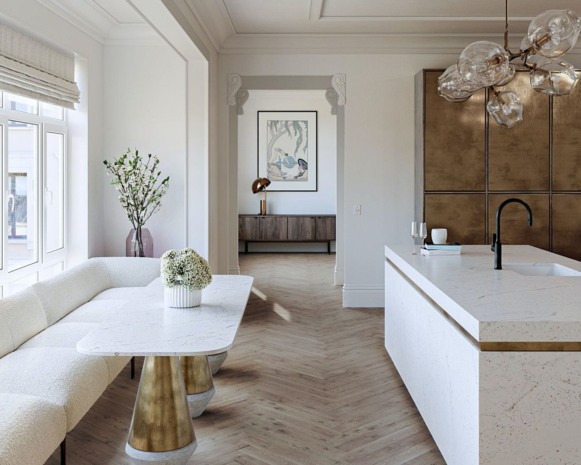 Modny kolor kaszmirowy w połączeniu z bielą oraz akcentami beżu stworzył w tym mieszkaniu niezwykle wyrafinowaną i elegancką mieszankę.
