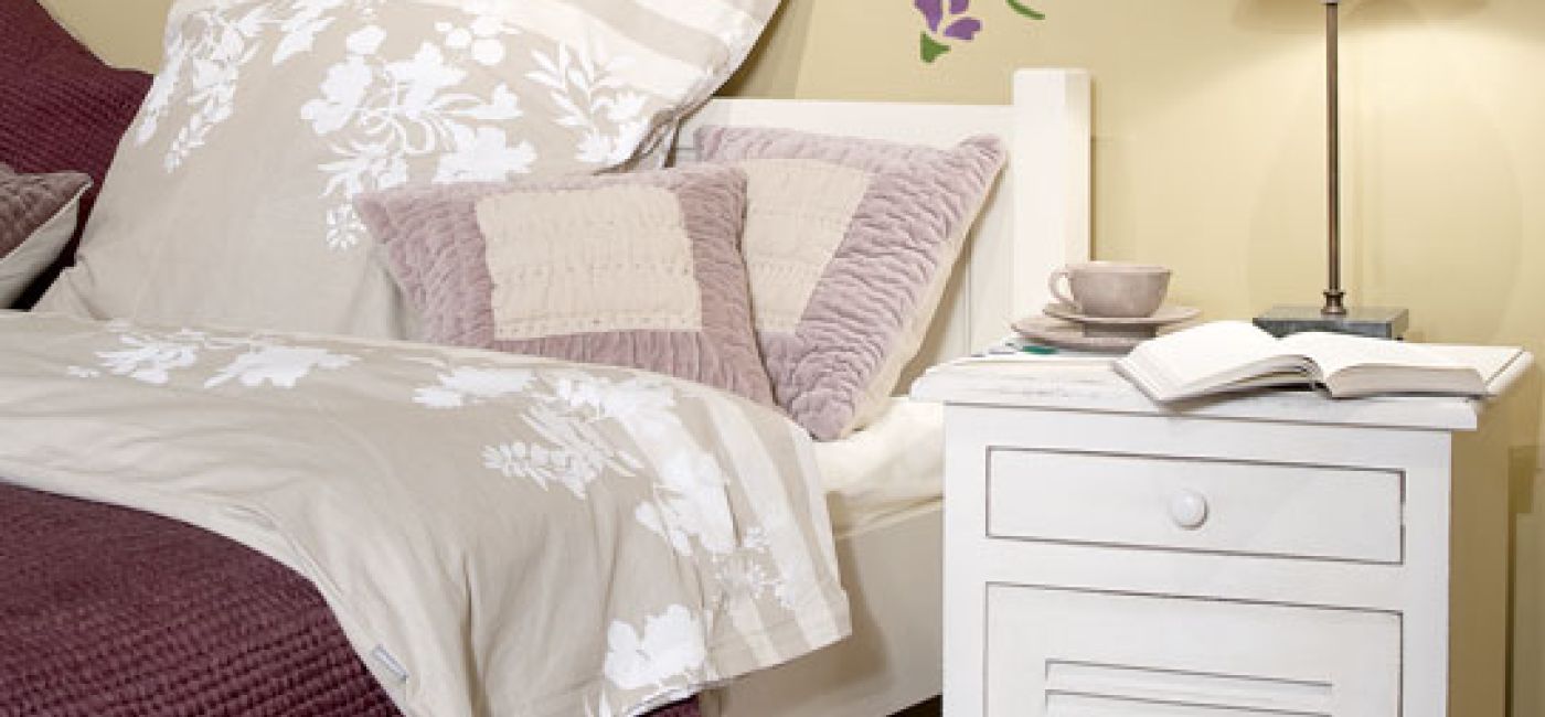 Chłodne fiołkowe kwiaty będą bardzo dobrze wyglądały w pastelowych wnętrzach, gdzie pojawia się dużo bieli, szarości, błękitów, zgaszonych różów, naturalnych beżów i brązów. Jeśli boimy się, że zrobi się za chłodno, w dodatkach powinno pojawić się więcej beżu i brązu. Kwiatowa, delikatna dekoracja będzie wyglądała równie dobrze na jasnych meblach, jak i na drewnianych, rustykalnych. My wybraliśmy stylizowane na stare, pastelowe mebelki z Fryderyk Gallery.