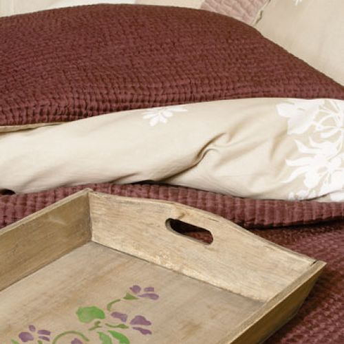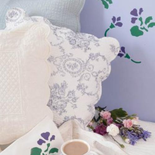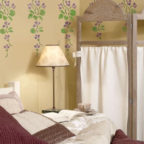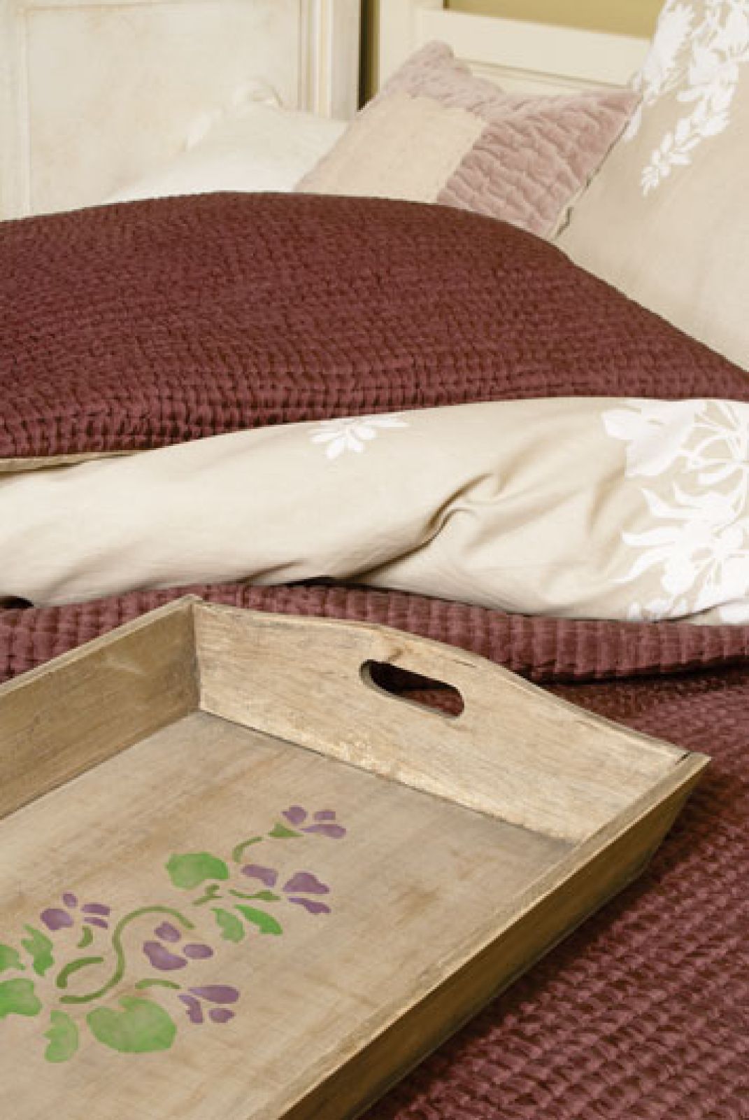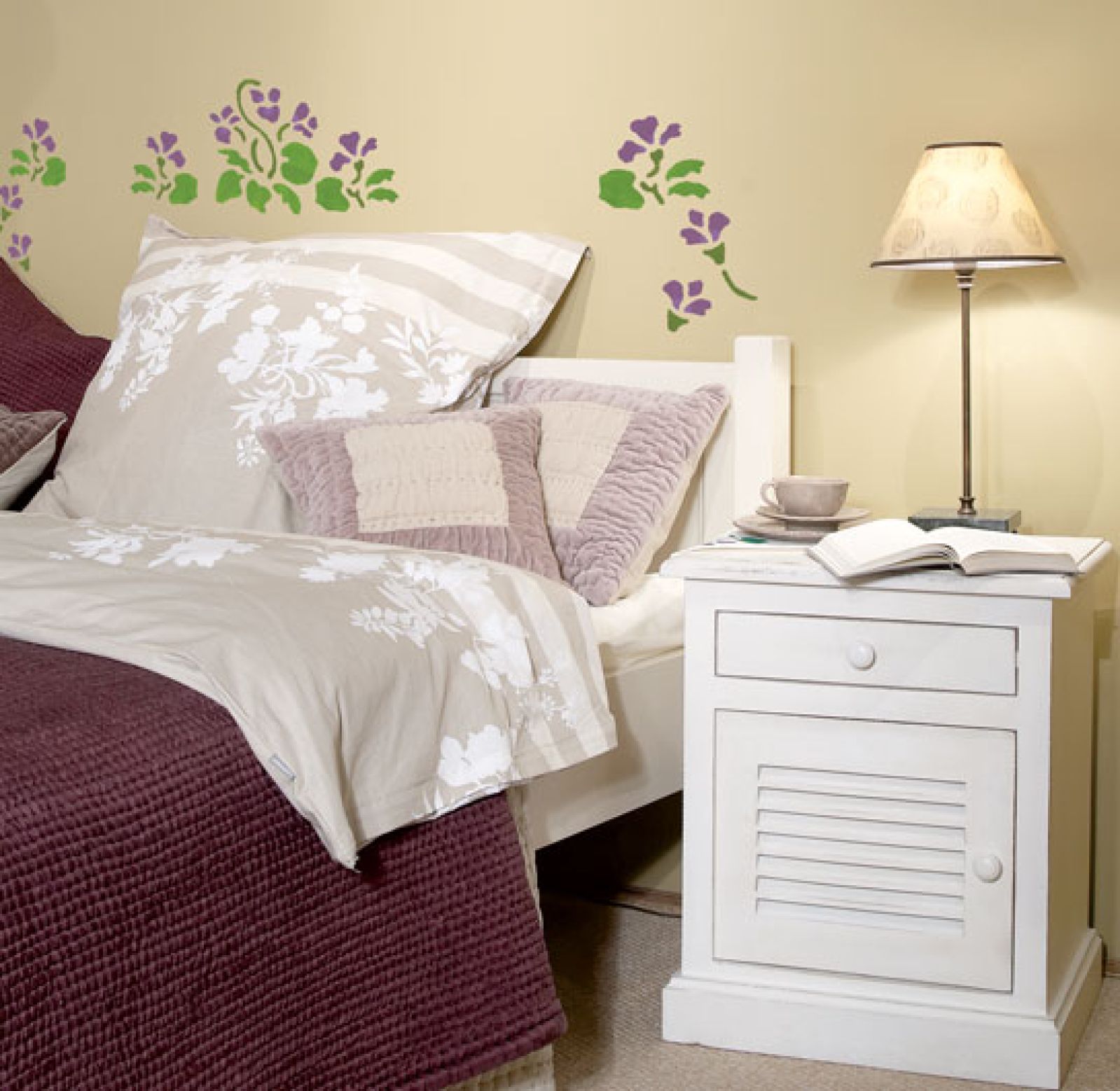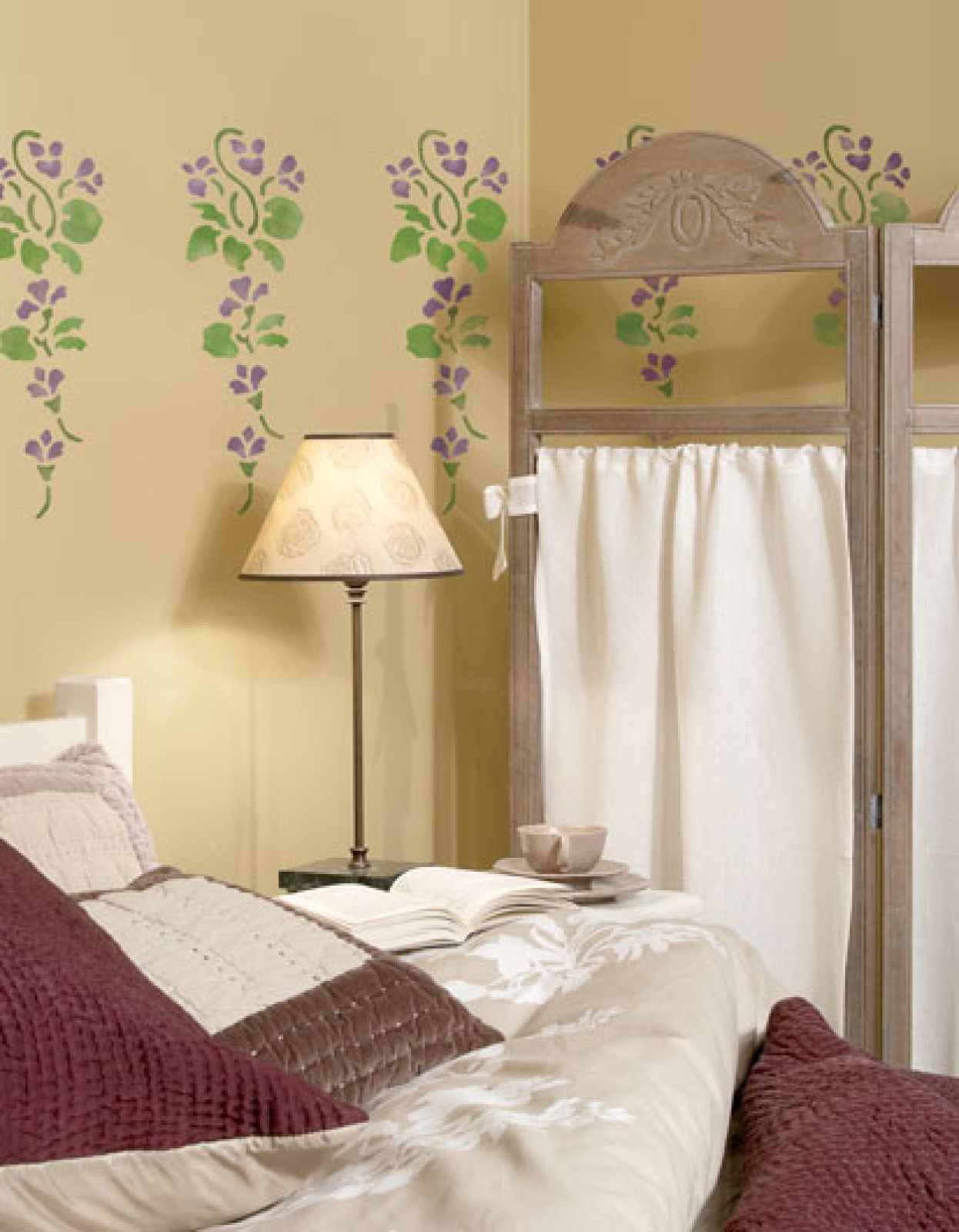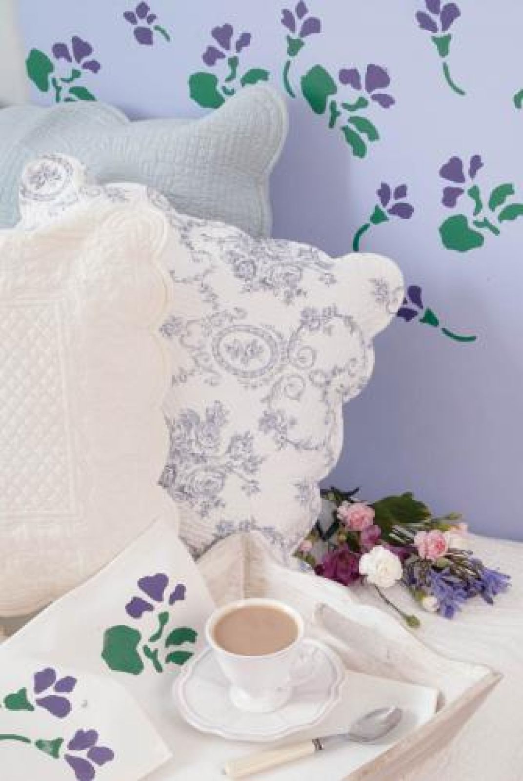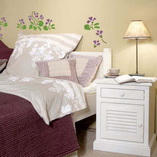 Jeżeli zaplanowaliśmy już rozmieszczenie półek, szafek i nie zamierzamy ich wkrótce przestawiać, warto zrobić im na ścianie fiołkowe obramowanie. Ciekawie będzie wyglądać na przykład dookoła ramy łóżka jako centralnego miejsca sypialni. Kwiatowy wzór możemy namalować także na meblach. Nawet jeśli nie są kompletem, ozdobione tym samym motywem stworzą harmonijną całość. I nie zapominajmy o dodatkach: własnoręcznie zdobionych serwetkach, tacach czy abażurach. W tak udekorowanym wnętrzu naprawdę poczujemy wiosenny powiew.