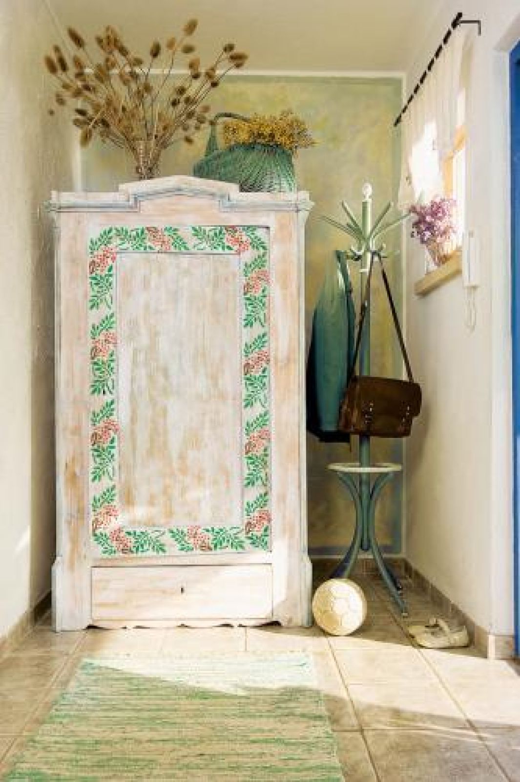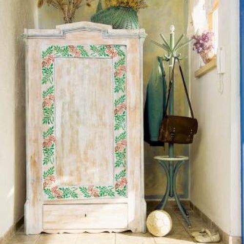 Wrzesień to najodpowiedniejszy czas, by zaproponować taki roślinny motyw – jarzębiny właśnie zaczynają owocować. Wzór bardzo przypadł nam do gustu (zapewne przez te wszystkie szczęśliwe wspomnienia). Redakcyjna koleżanka ozdobiła nim na początek szafę. Mebel był bez wyrazu w biało-piaskowym kolorze.