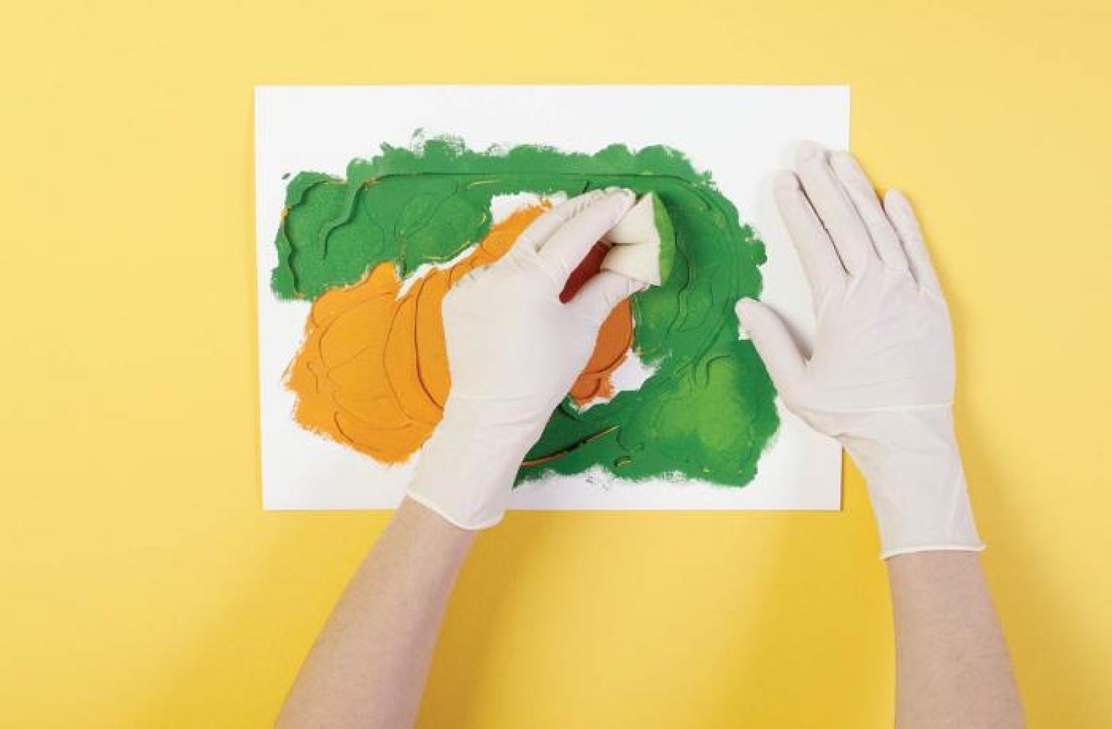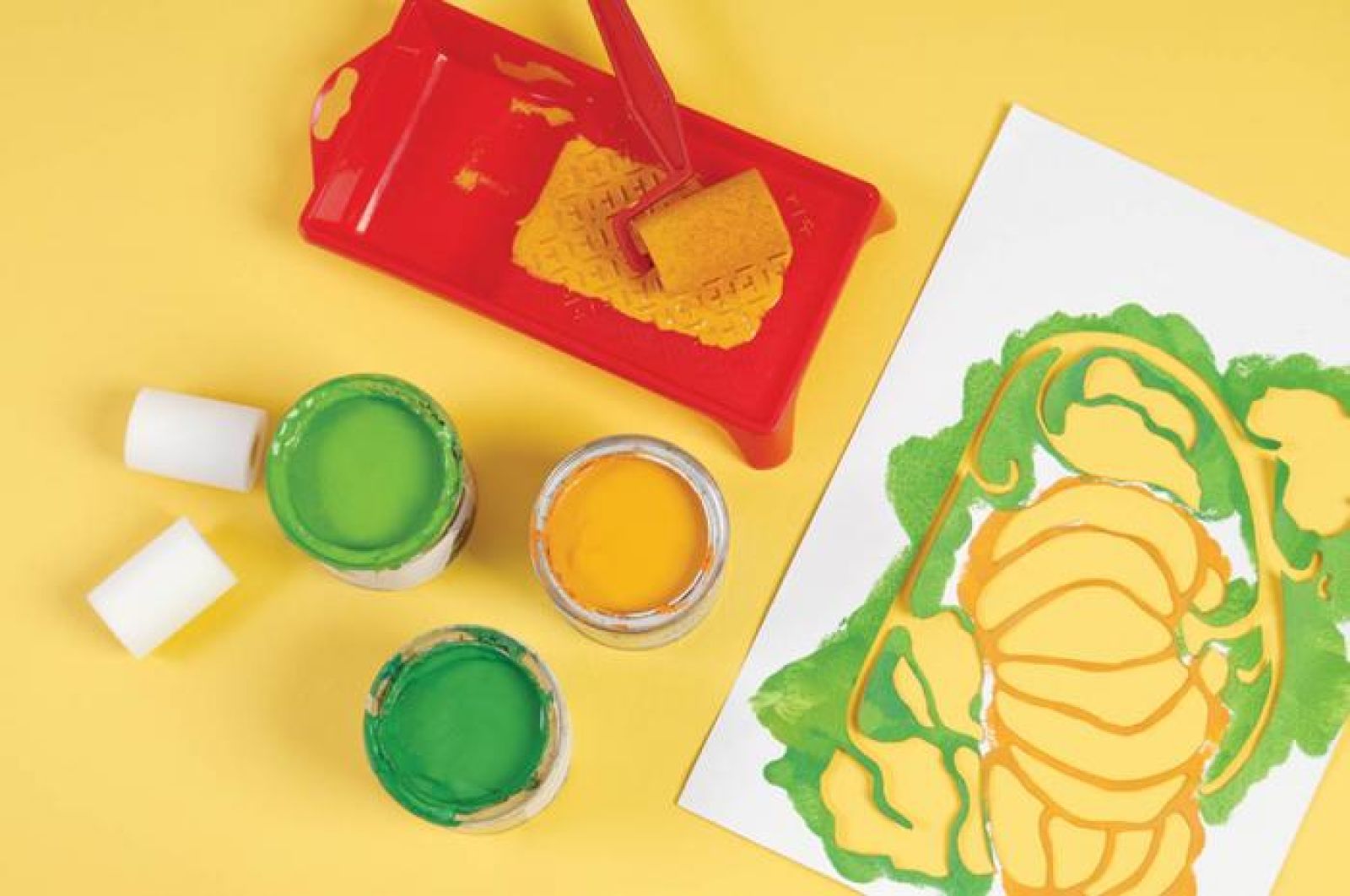 Pracę zaczynamy od rozplanowania wzoru. Potem przykładamy szablon i malujemy kolejno elementy na kolor pomarańczowy i zielony.![]()