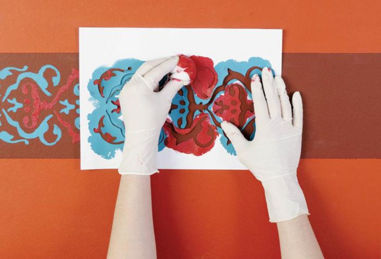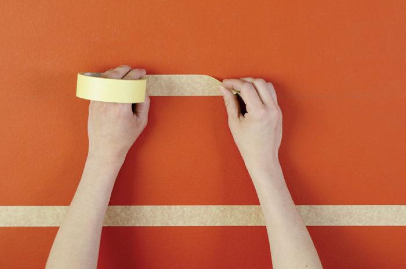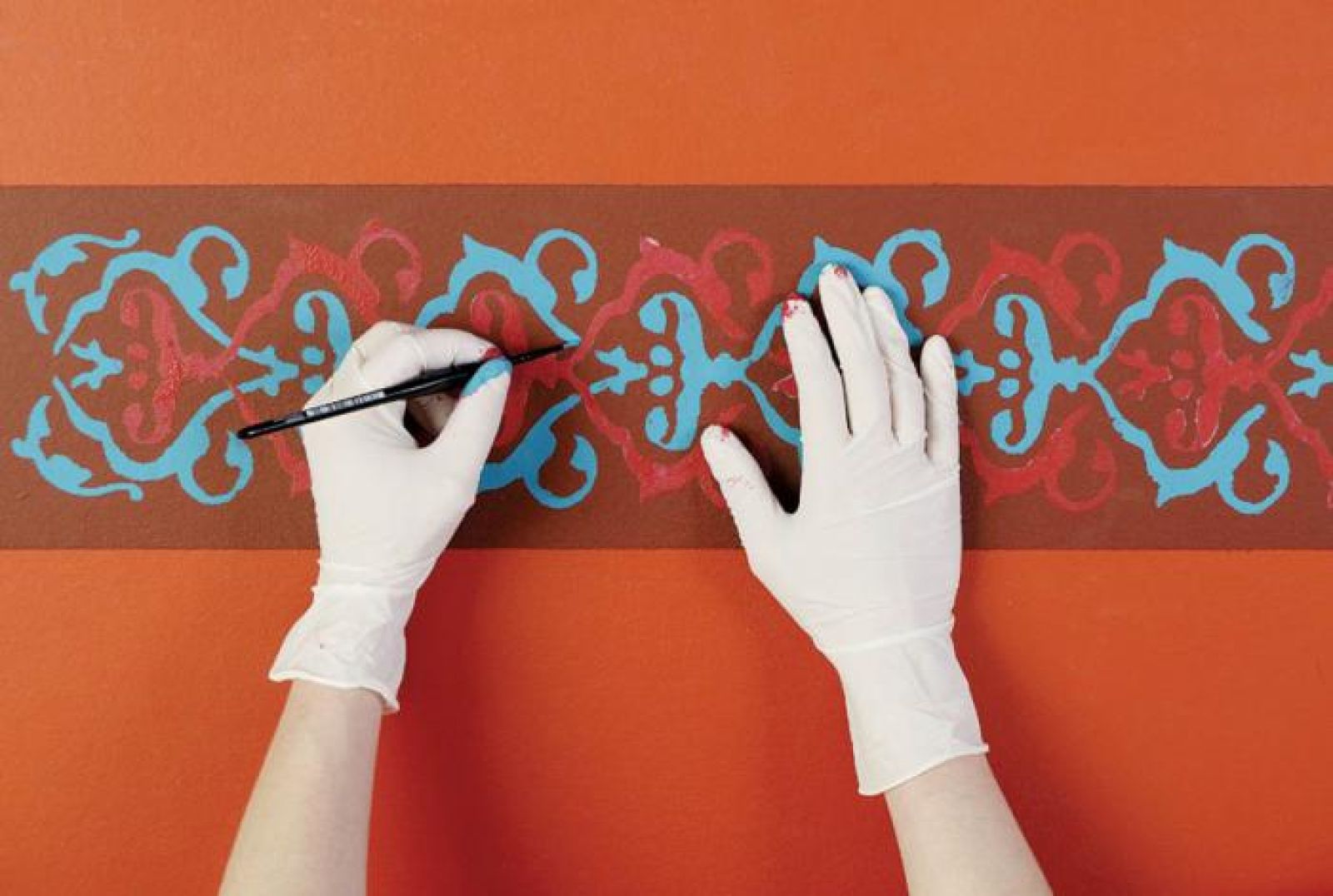 Zaczynamy od namalowania na ścianie pasa w kolorze bordo. Najpierw wyznaczamy jego szerokość za pomocą ołówka i linijki, przyklejamy taśmę malarską, żeby łatwiej nam się malowało. Kiedy powierzchnia wyschnie, bierzemy się za ornament – najpierw niebieski, potem czerwony.![]()