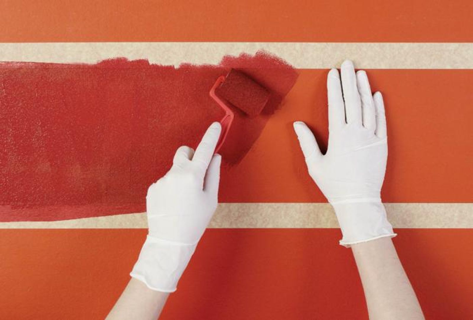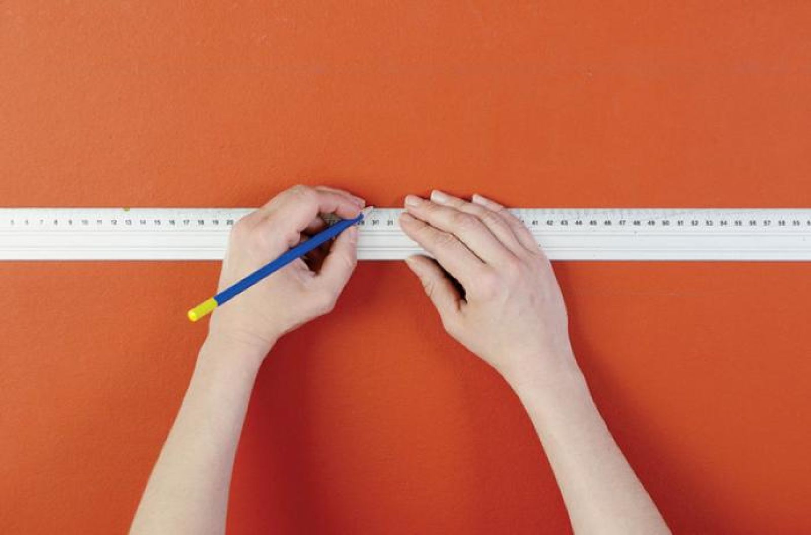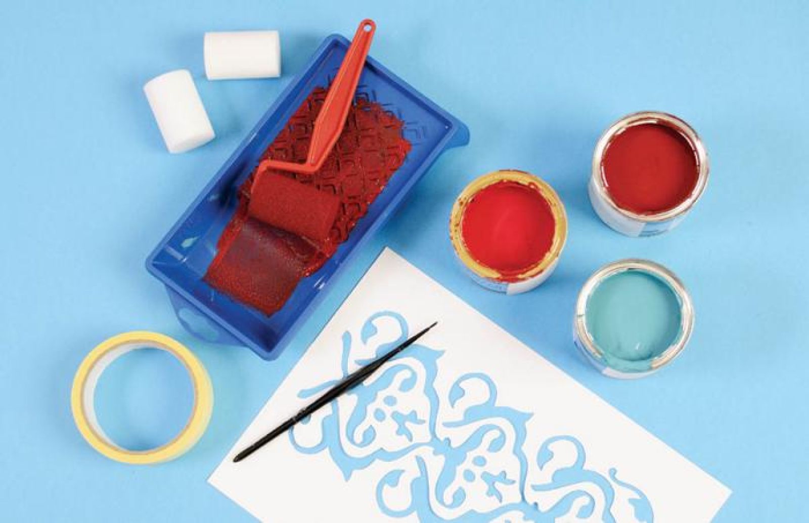Zaczynamy od namalowania na ścianie pasa w kolorze bordo. Najpierw wyznaczamy jego szerokość za pomocą ołówka i linijki, przyklejamy taśmę malarską, żeby łatwiej nam się malowało. Kiedy powierzchnia wyschnie, bierzemy się za ornament – najpierw niebieski, potem czerwony.![]()