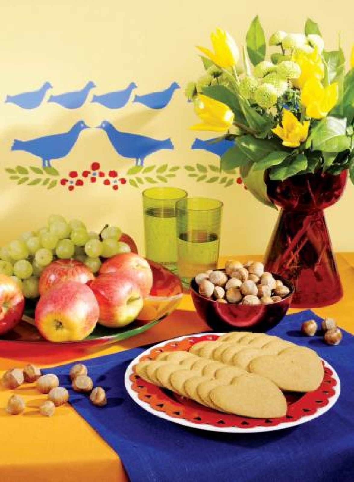 Druga wersja – barwna i radosna – pasuje do wnętrz rustykalnych lub przytulnych wiejskich domów. Freski można namalować zarówno na ścianie, jak i na różnych drewnianych elementach. Ptaki pięknie udekorują stary stół, ramę łóżka czy drzwi z postarzanego drewna. To tylko propozycje, resztę pozostawiamy waszej wyobraźni. Ważne, żeby było nastrojowo i elegancko.