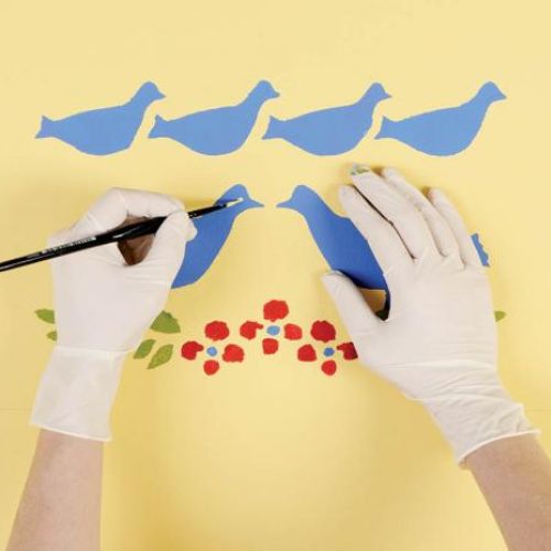 Po wytyczeniu linii wzoru zaczynamy pracę od nałożenia największych plam barwnych, czyli niebieskich ptaszków. Pamiętajmy, aby nie zamalować gałązek, na których stoją! Dla ułatwienia możemy przykleić wąski kawałek taśmy papierowej, oddzielając nóżki od liścia. Listki barwimy wałeczkiem, a płatki małym stempelkiem lub tamponem z gąbki. Drobne elementy, takie jak środki kwiatków i oczy, domalowujemy cienkim pędzelkiem. Jeżeli wzór wydaje się zbyt bogaty, można zrezygnować z górnej jego części lub namalować ją oddzielnie w zupełnie innym miejscu.