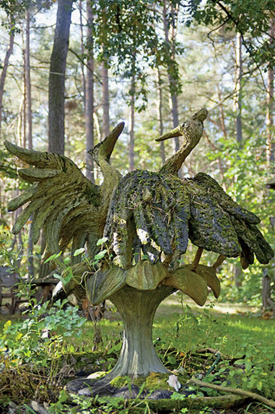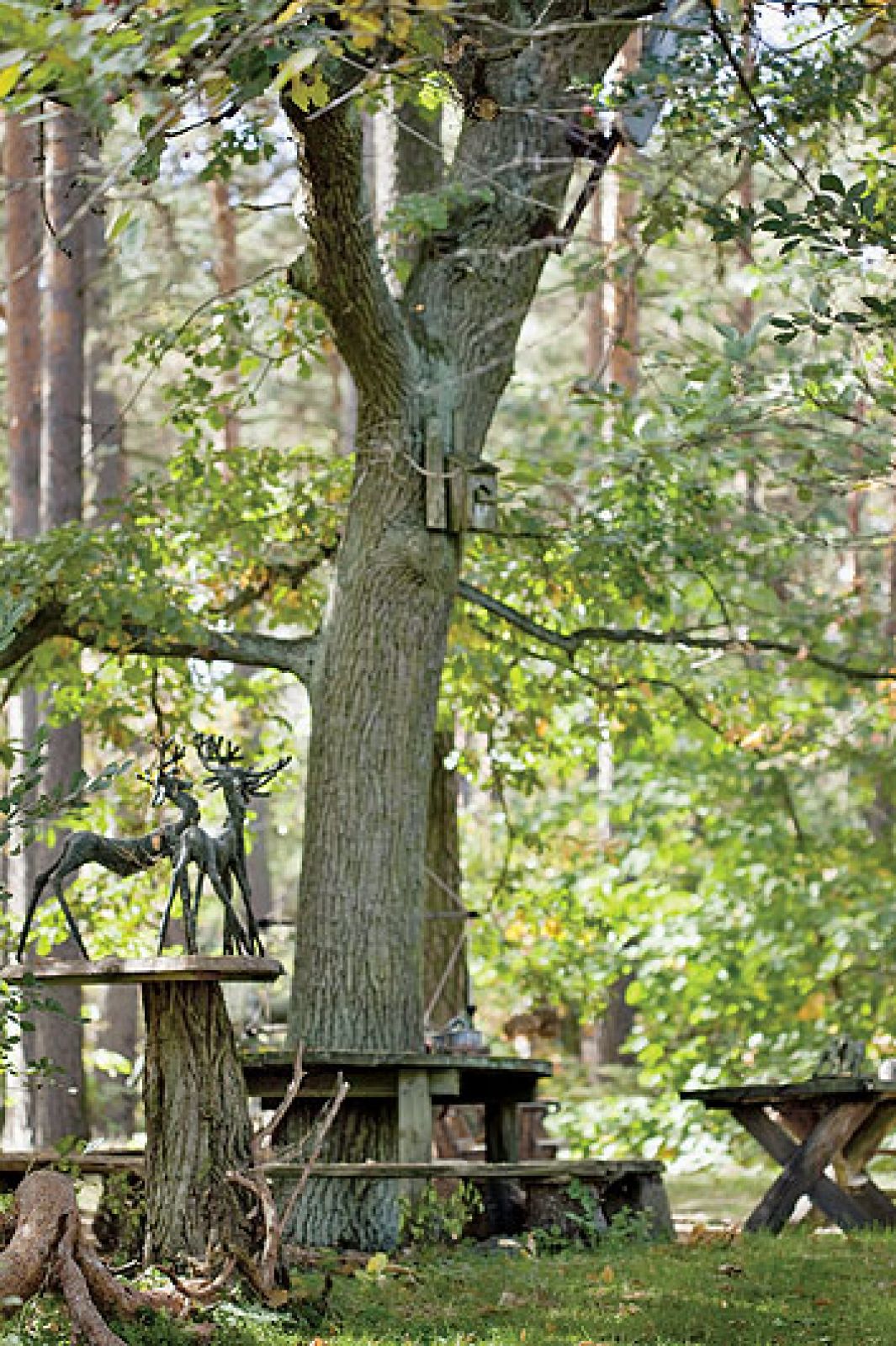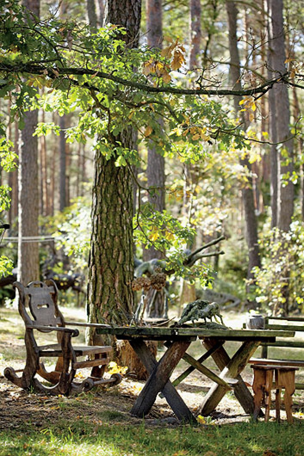 Leśną siedzibę rzeźbiarka kupiła jeszcze w latach 60. ubiegłego wieku. Szukała dworków, bo potrzebowała miejsca dla koni arabskich, które hodowała. Po dwóch latach niepowodzeń wreszcie trafiła tutaj, do niewielkiego domu zbudowanego z drewna przez przedwojennych cieśli. Urzekł ją i on, i wielkie drzewa wokoło. – Nie lubię czekać, a nim małe drzewa urosną, musi minąć sporo czasu – mówi artystka. Sam dom emanuje dobrą energią. – Jest dla mnie życzliwy, ja go kocham, a on mnie – opowiada. Podobnie z drzewami. Gdy kiedyś pracownicy elektrowni zasugerowali ich ścięcie, bo mogą się wywrócić, rzeźbiarka kategorycznie odmówiła. – Kochamy się nawzajem i do żadnych wypadków nie dojdzie – stwierdziła. Faktycznie, drzewa jak stały, tak do tej pory stoją i ani myślą rwać elektryczną trakcję.