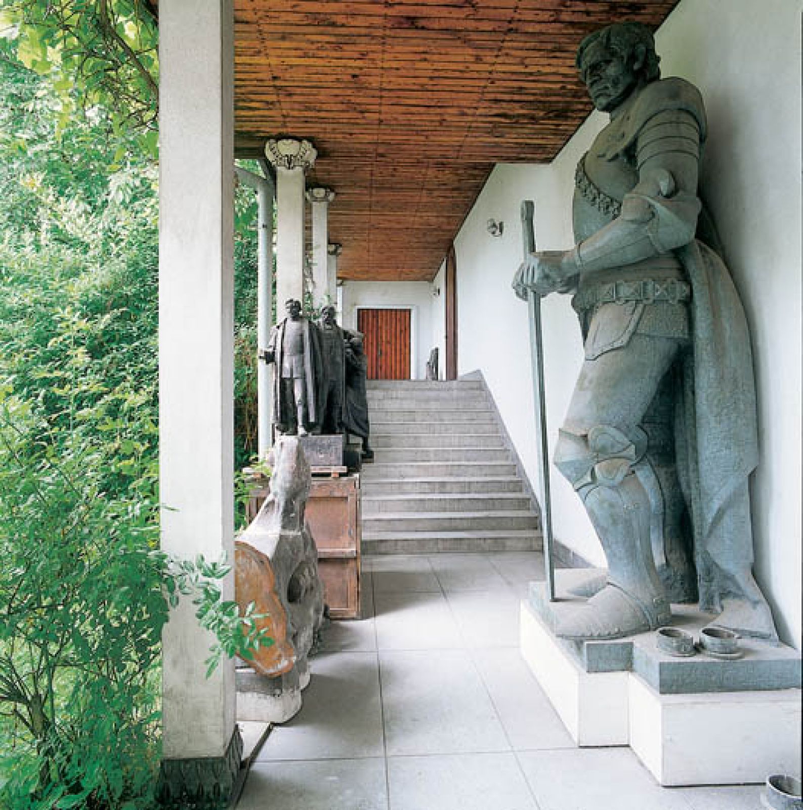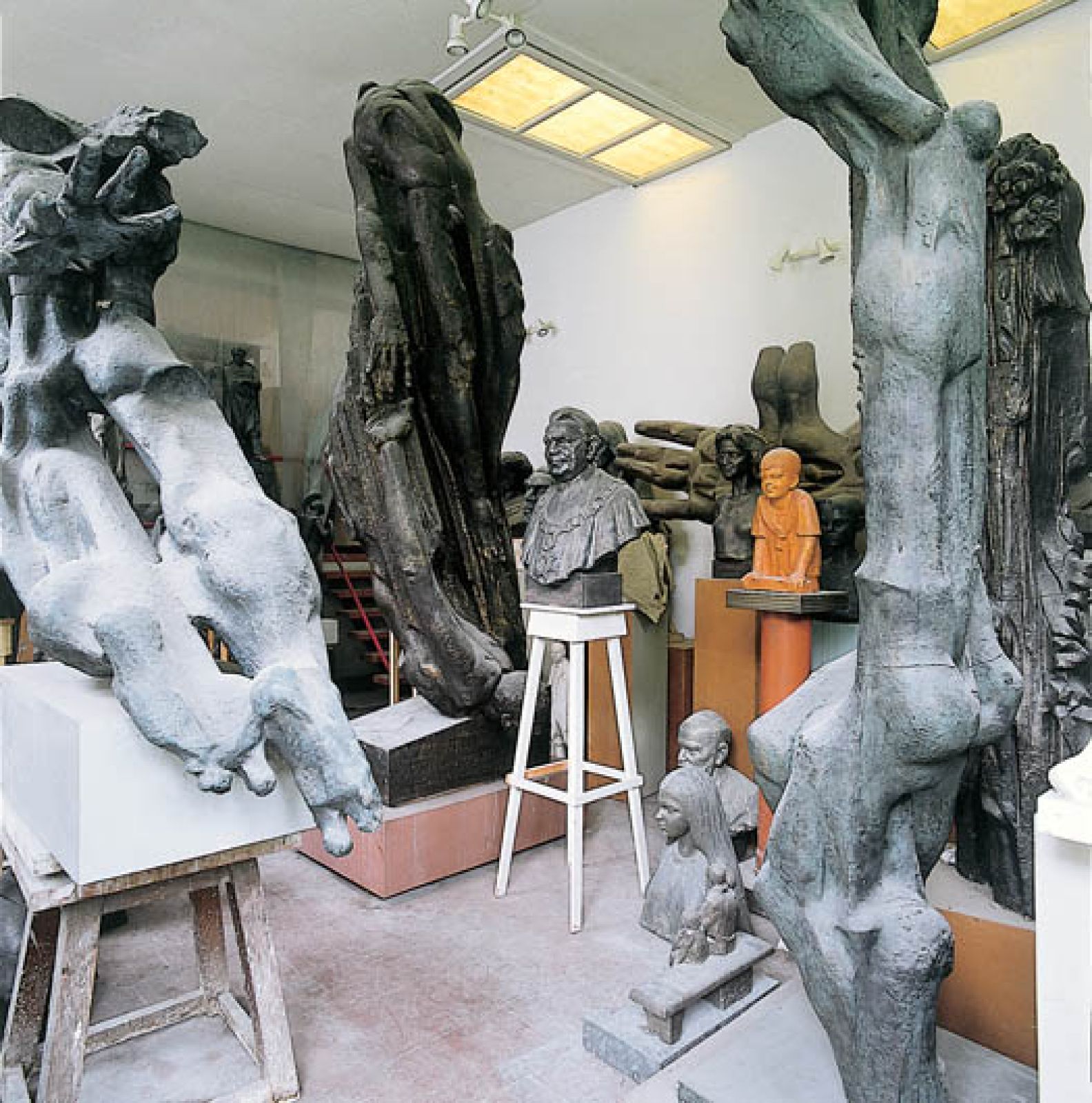 Atelier Mariana Koniecznego łączy się z położonym nieco wyżej na zboczu domem. To miejsce wyjątkowe. Powstało na początku lat 70. u stóp kopca Kościuszki. Z tarasów widać Wisłę, a w oddali zarys Wawelu. Do pracowni można zejść otwartym pasażem, który oddzielają od ogrodu tylko filary z oryginalnymi kapitelami. Profesor sam je zaprojektował i nie ma dwóch takich samych. Tu mieści się także galeria jego rzeźb, a dokładnie gipsowych modeli, które pozostają, gdy gotowe monumenty ruszają w świat. W końcu to tu powstały najsłynniejsze z jego rzeźb, jak choćby warszawska Nike.