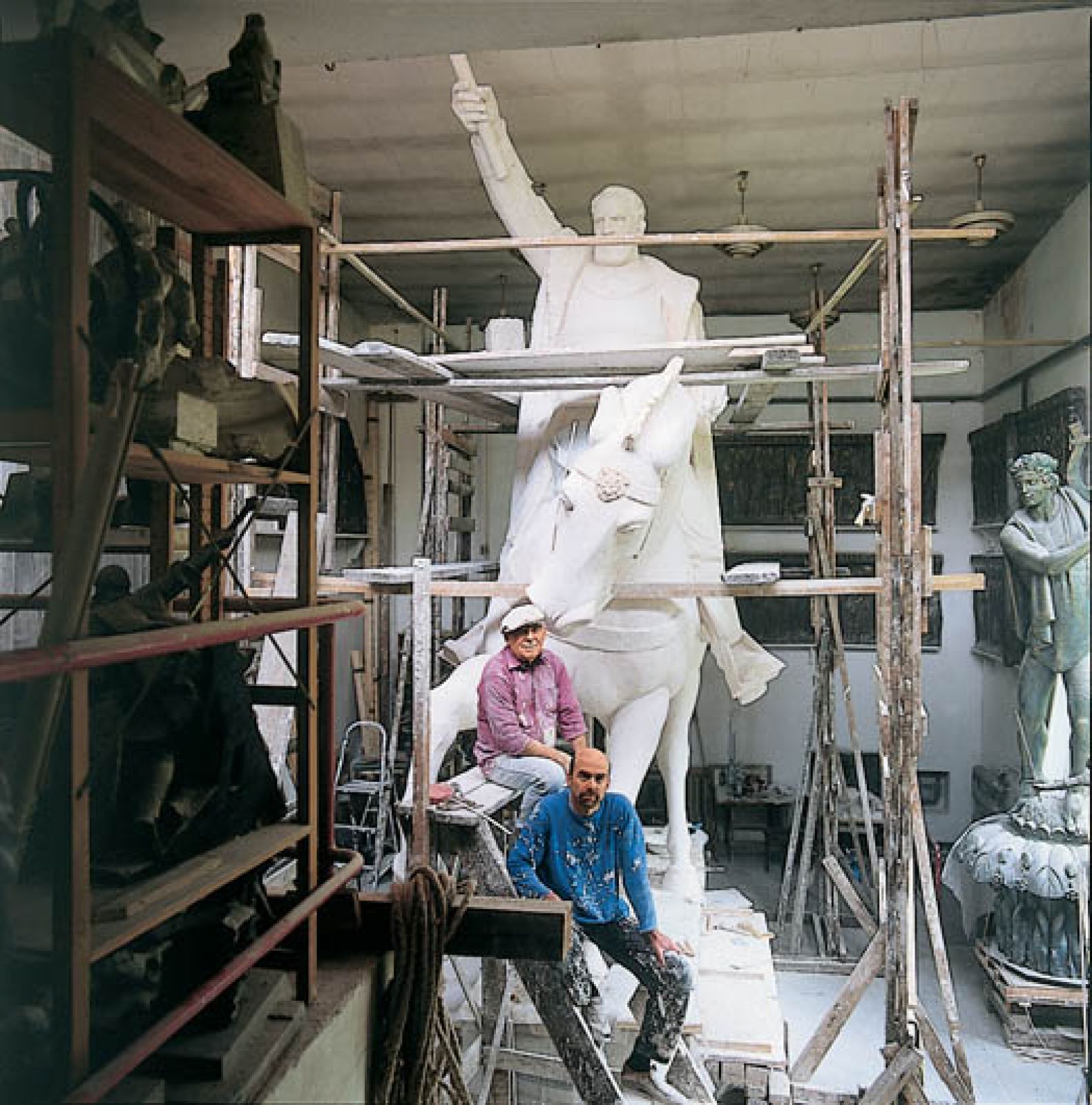 Artysta zwykle zaczyna pracę od zrobienia małych szkiców w glinie i gipsie. W miarę dojrzewania pomysłu przygotowuje projekty w coraz większej skali. W końcu powstaje gipsowy model w skali jeden do jednego, z którego potem odlewa się rzeźbę w brązie. Pierwszym gigantem, który narodził się w tej pracowni, był mityczny nowohucki Lenin, „wyprowadzony” ostatecznie z Nowej Huty na fali Solidarności i odnowy. Odkupił go od władz miasta szwedzki kolekcjoner i uczynił atrakcją swojego Parku Osobliwości. Inne ważne dzieło to krakowski Pomnik Grunwaldzki – kopia przedwojennej rzeźby Antoniego Wiwulskiego, powstałej w pięćsetną rocznicę bitwy pod Grunwaldem, a zniszczonej przez hitlerowców. Ponieważ zachowało się mało zdjęć dokumentujących przedwojenne dzieło, Konieczny pojechał nawet do Paryża, gdzie żyła jeszcze córka współpracownika Wiwulskiego. Odnalazł model pomnika i, co najważniejsze, karton z naniesionymi wymiarami. Dzięki temu mógł wiernie odtworzyć dzieło. Na początku lat 80. Konieczny wygrał konkurs na projekt pomnika Wyspiańskiego, który ostatecznie stanął przed gmachem Muzeum Narodowego w Krakowie. Spacerując aleją 3 maja, zobaczymy zadumaną postać młodopolskiego artysty w otoczeniu postaci z jego utworów: „Nocy Listopadowej”, „Wesela”, „Wyzwolenia”.