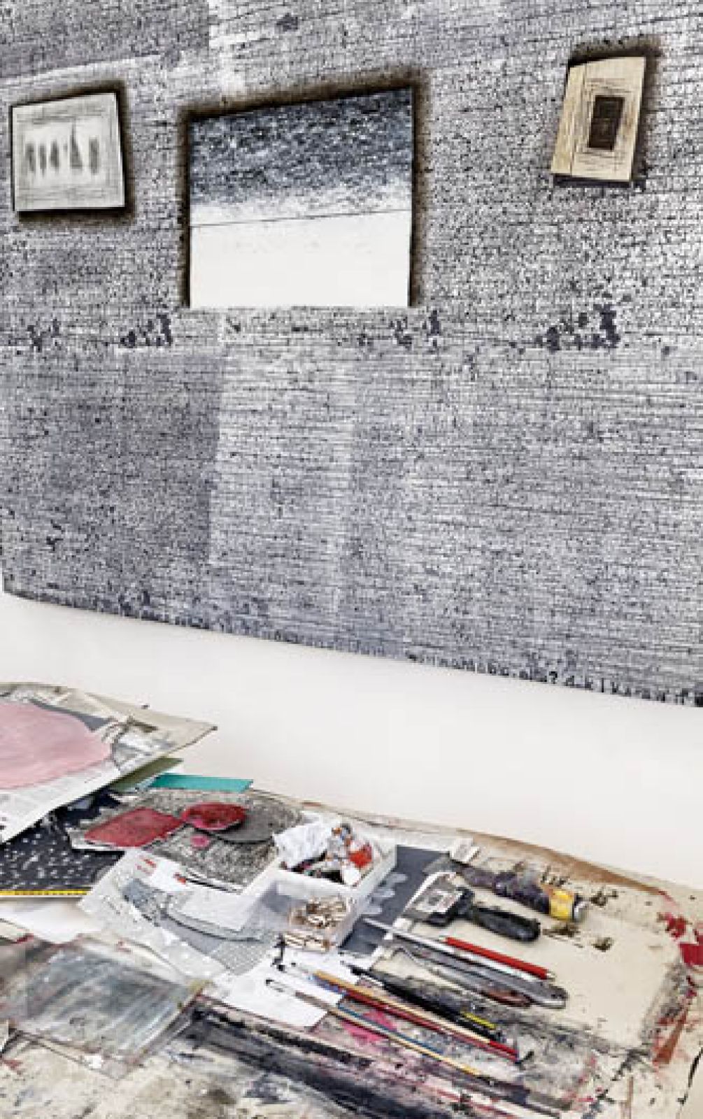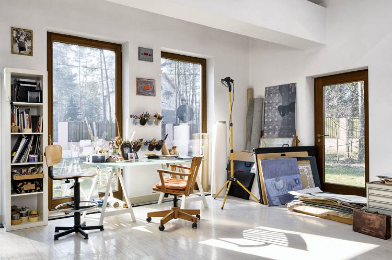 Kiedy wchodzi się do mieszkania, minipracowni nie widać, bo mieści się… w szafie. Wnękę przysłaniają harmonijkowe drzwi wtopione w ścianę. Całość Ela sama ozdobiła ornamentem w różyczki. – To był heroiczny wysiłek: zrobić grafikę nadrukowaną na całą ścianę – opowiada artystka. – Znalazłam wałek, taki, jakim w dawnych czasach malowano tapety, z jego pomocą zrobiłam tło farbą drukarską. Na to naniosłam ciemnoczerwone stemple-różyczki. Jednak prawdziwa pracownia z graficzną prasą (potężny metalowy obiekt, wymagający miejsca i mocnej podłogi) znajduje się w podwarszawskim Zalesiu. Konrad, mąż Eli, buduje tam dom. Taki prawdziwy, z lasem dookoła. Choć całości daleko do ukończenia, atelier jest gotowe. Okna z trzech stron plus świetliki w suficie. W słoneczne dni światło aż poraża.