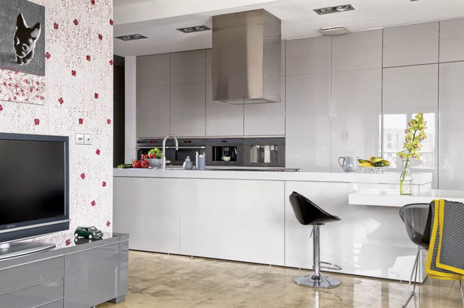 W nowym mieszkaniu Elżbieta najpierw wyburzyła ściany oddzielające kuchnię od salonu. W tak dużej przestrzeni połączyła surowy styl hi-tech (w części kuchennej i przedpokojowej) z luzacko zagospodarowaną częścią rekreacyjną. O tym, gdzie kończy się jedno, a zaczyna drugie, dyskretnie przypomina podłoga. W strefie gospodarczo-roboczej pozostał surowy beton, zalany przezroczystą, wypolerowaną żywicą; w salonowo-rekreacyjnej bambusowe deski nasączone czarną farbą. Jednak livingroom u Baneckich nie służy tylko przyjemnościom. Pani domu wygospodarowała tu sobie miejsce do pracy.