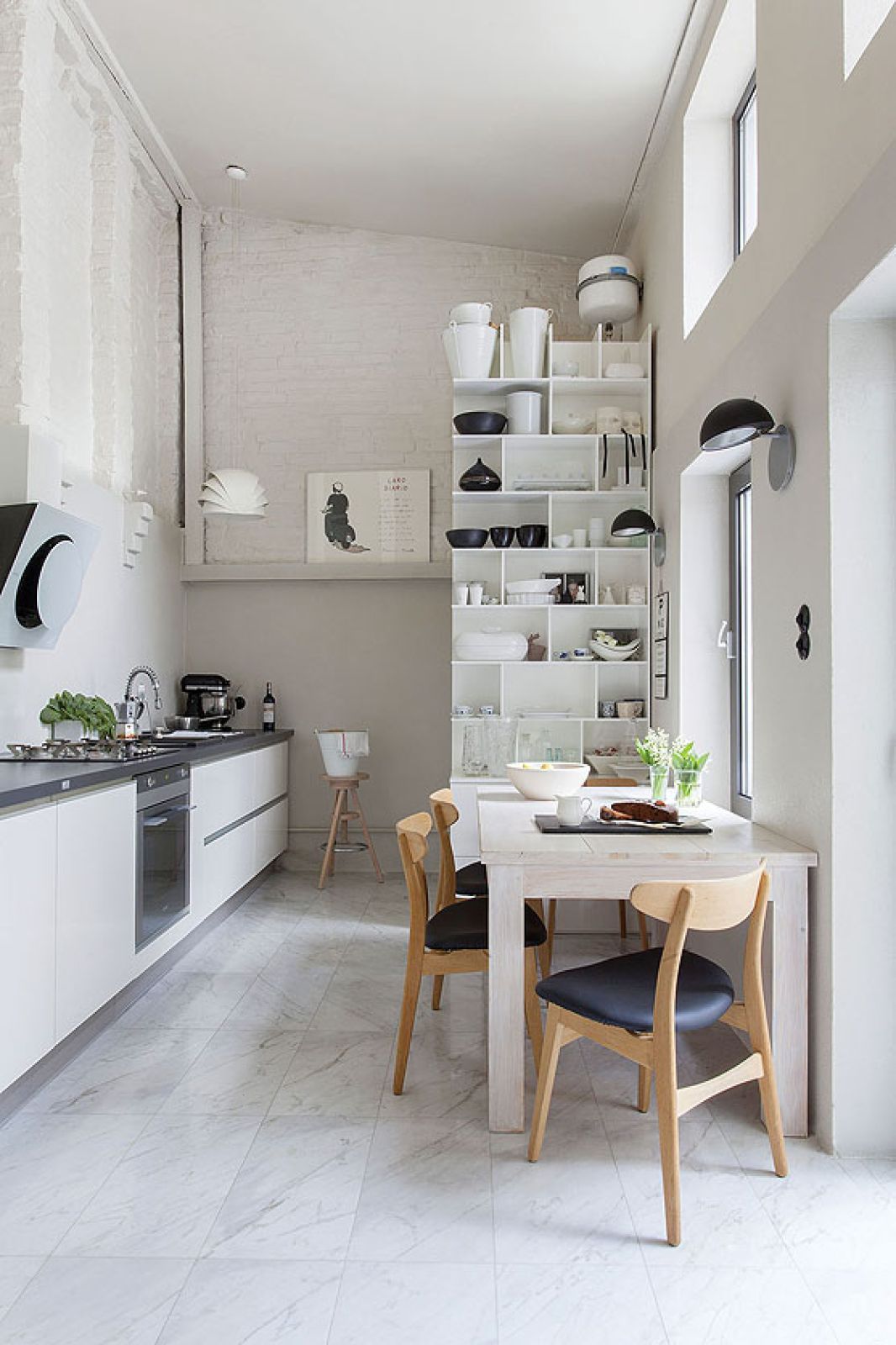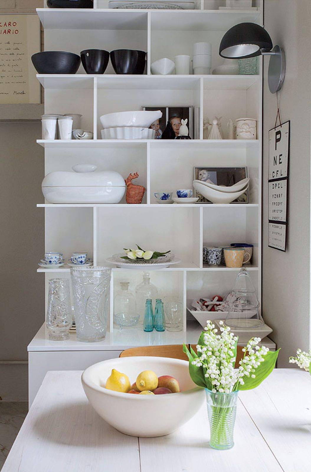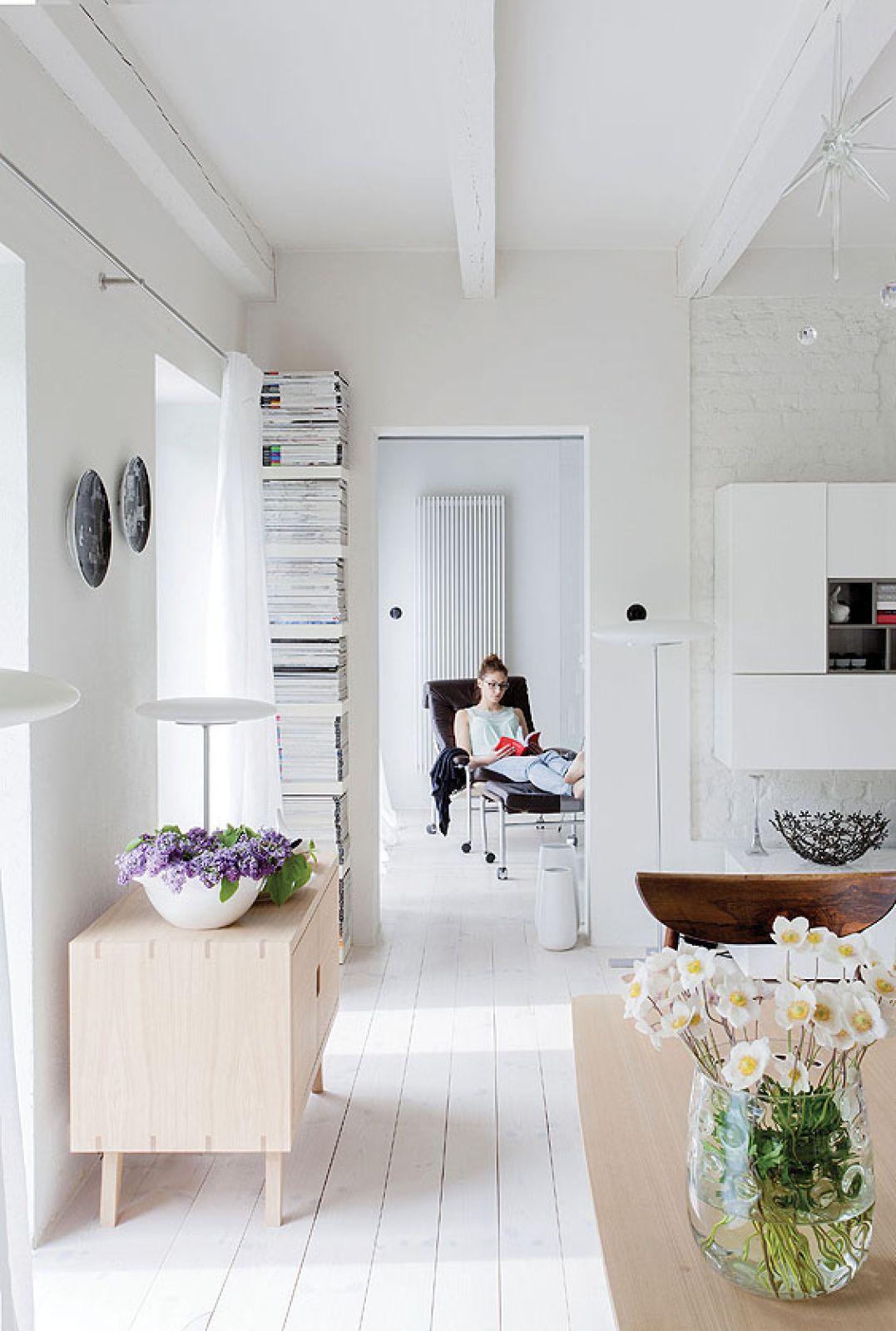 Wszechobecna biel, jak w skandynawskich siedliskach, dodaje wnętrzu oddechu. Ściany z czerwonej cegły zostały w całym domu pobielone wapiennym tynkiem – wyglądają surowo, ale jednocześnie odbijają światło jak śnieg. Zabieg ten, znany na północy Europy, sprawia, że łatwiej wykorzystać każdy promień słońca, którego tak często brakuje nad Bałtykiem. Zafascynowany skandynawskimi klimatami Jacek na bielonych ścianach nie poprzestał. Arktycznym, szronionym odcieniem pociągnął wszystko, co się dało: drewniane podłogi w domu i na tarasie, stopnie schodów, meble w kuchni i salonie. Muślinowe zasłony wyglądają jak mleczna mgła, a kryształowe naczynia – jak sople lodu.