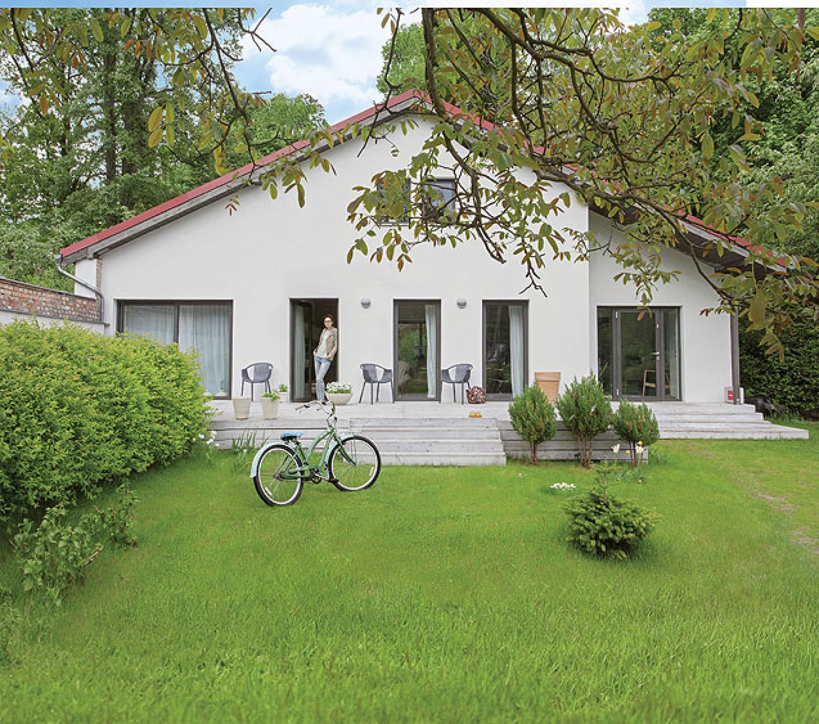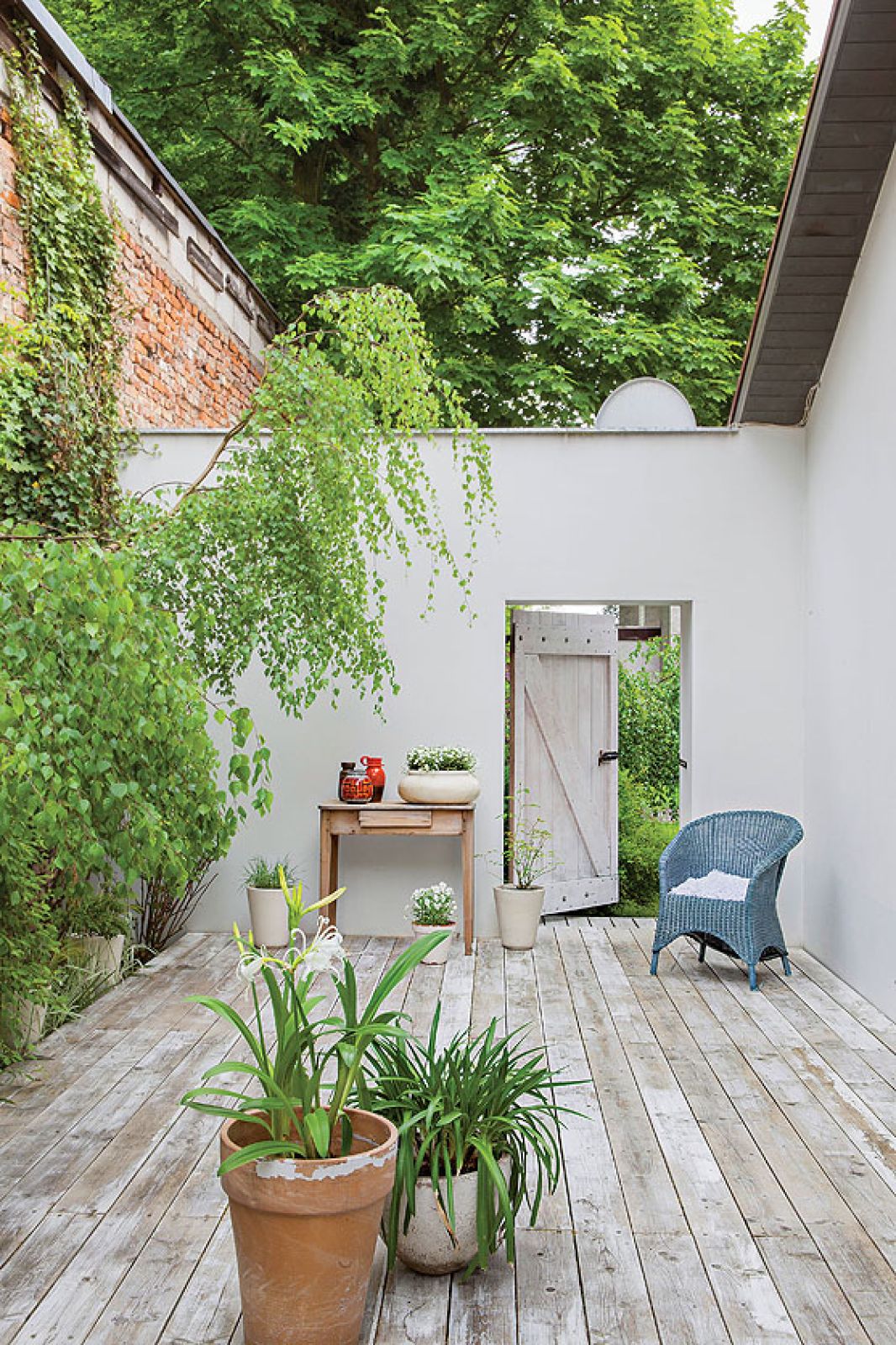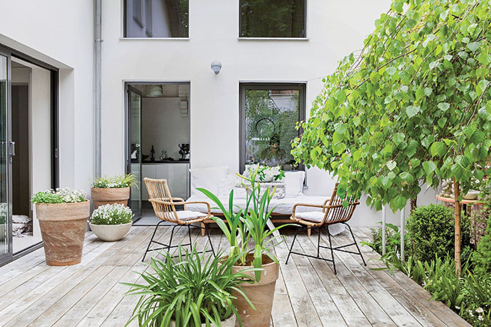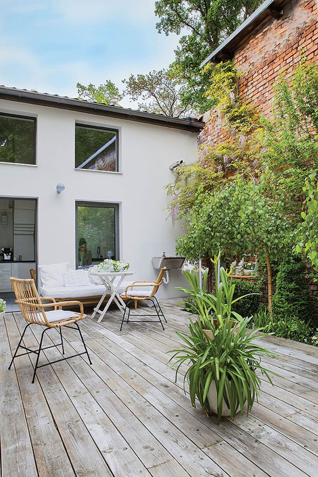 Dzięki szklanej ścianie główna część domu wydaje się jeszcze większa, bo otwiera się na patio. Na taras można wyjść także z kuchni, więc gdy tylko sprzyja pogoda, rodzina jada posiłki na dworze. Jedną ścianę patio tworzą drzewa – subtelne białe brzozy i cyprysy, obok – krzewy hortensji i wisterii, które projektant posadził wspólnie z żoną Wioletą, doktorem biologii na Uniwersytecie Szczecińskim. Latem ustawiają na tarasie mnóstwo kwiatów w donicach.