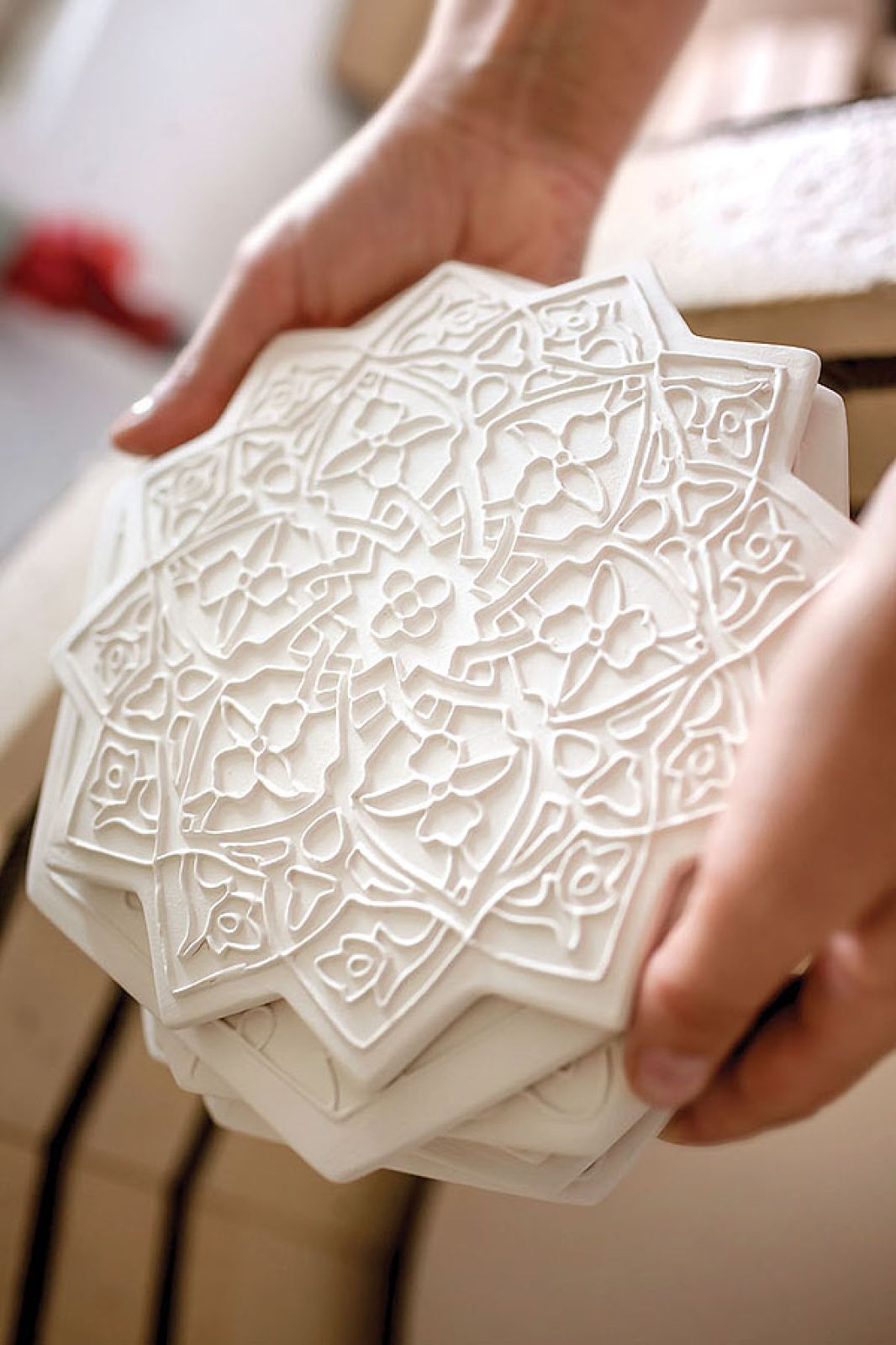 Próbowała majoliki, czyli ceramiki pokrytej nieprzezroczystą polewą, potem cuerda seca, w której różne kolory szkliw oddziela się od siebie tłustym pigmentem, aby się nie zlewały. – Potem przyszła kolej na zellige, marokańską ceramiczną mozaikę, która pochłonęła mnie całkowicie – mówi. Technika polega na tym, że poszkliwione płytki obłupuje się metalowymi dłutami. Tak przygotowane geometryczne elementy układa się w skomplikowane wzory. Kafelki, nad którymi teraz pracuje, nawiązują do wzornictwa zellige, ale robi je trochę inaczej.