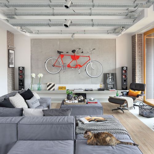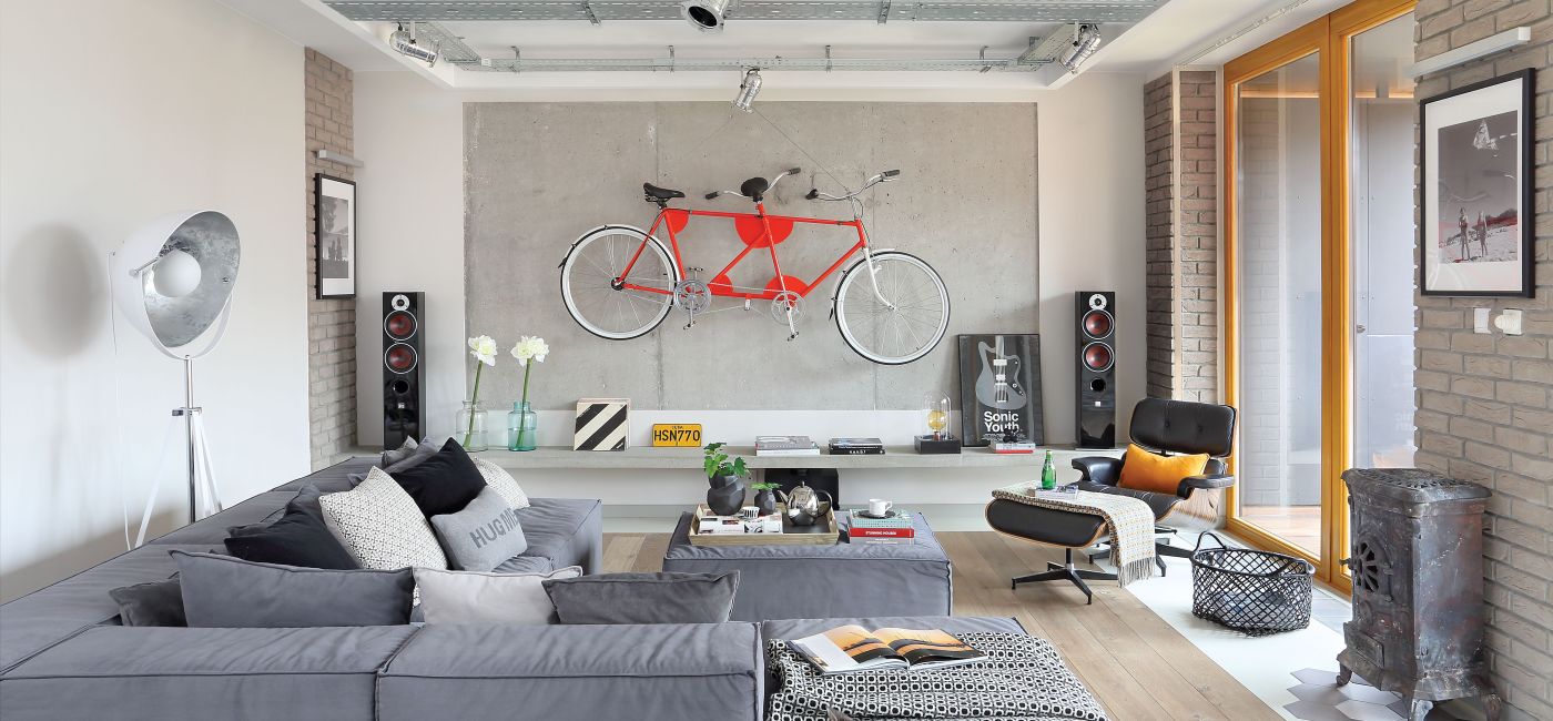 Jesteśmy w mieszkaniu na luksusowym strzeżonym osiedlu, ale czujemy się jak w domu awangardowych artystów. Taki luz i fantazja. I nie chodzi tylko o rower na ścianie.