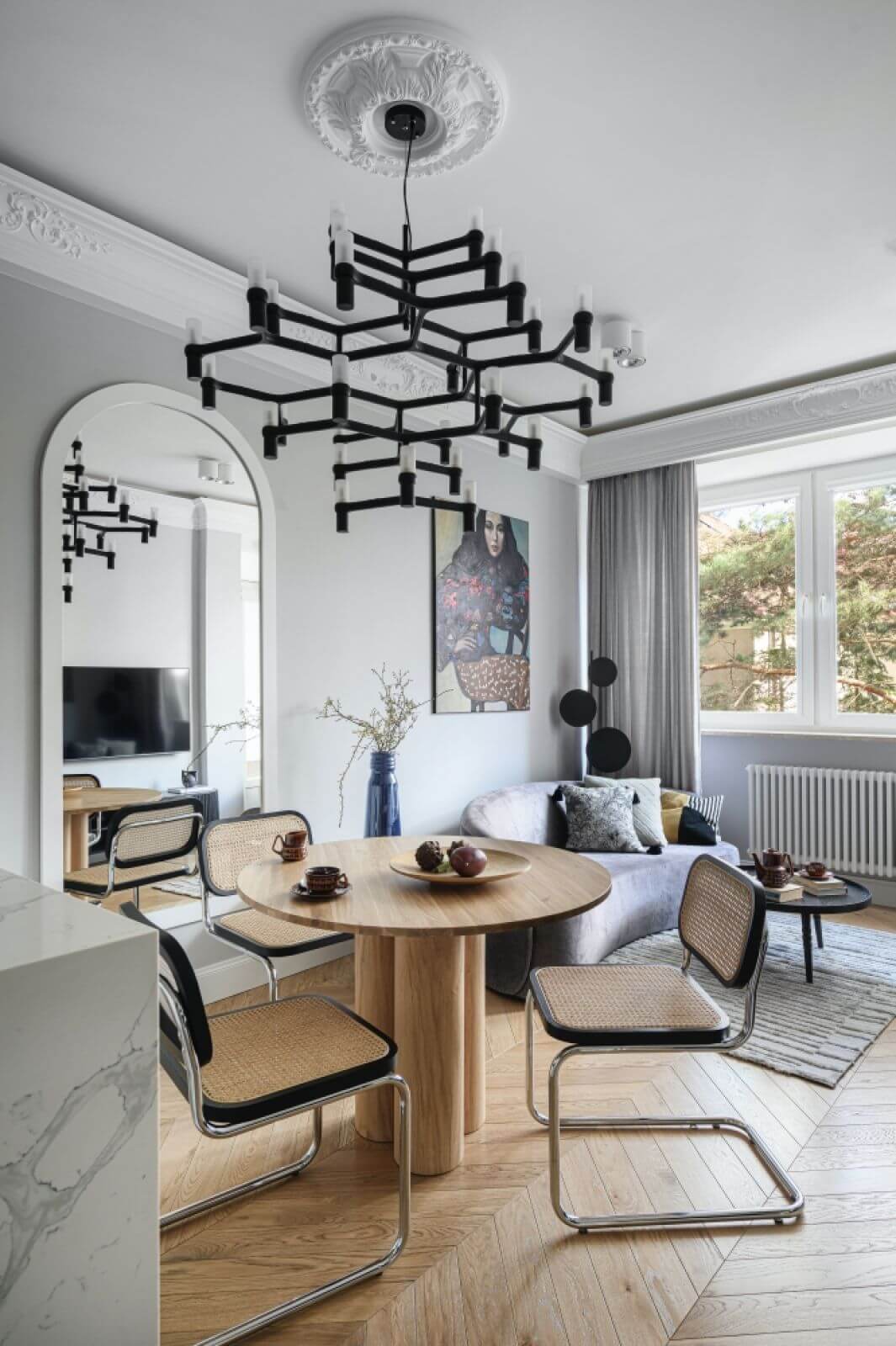 Z założenia miało być eklektycznie – miks elementów stylowych (np. sztukaterii) oraz tych inspirowanych art déco i Bauhausem, co widać w doborze mebli i detalach.