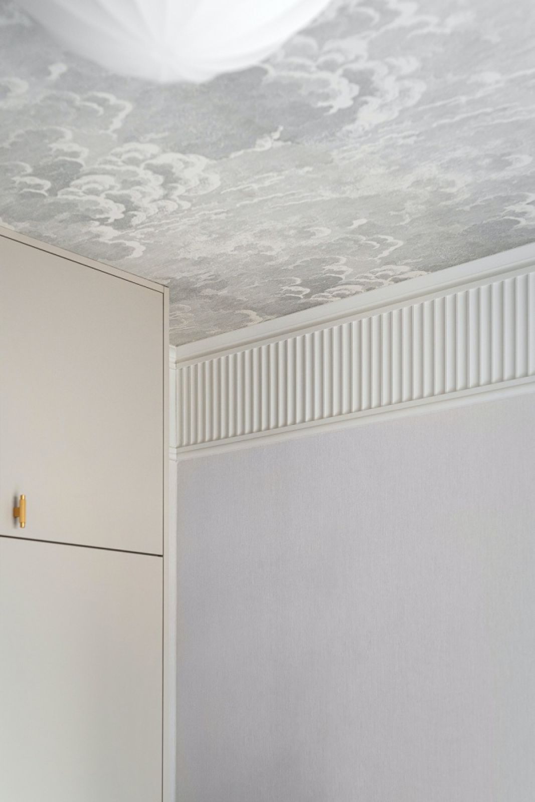 Położenie tapety z motywem chmur na suficie pełni wiele funkcji: optycznie podwyższa sypialnię, dodaje jej głębi, uatrakcyjnia wnętrze oraz pozwala osobom leżącym na łóżku się zrelaksować.