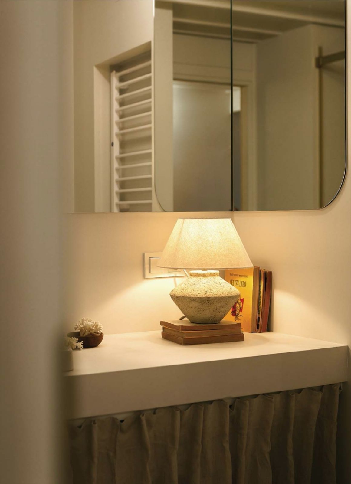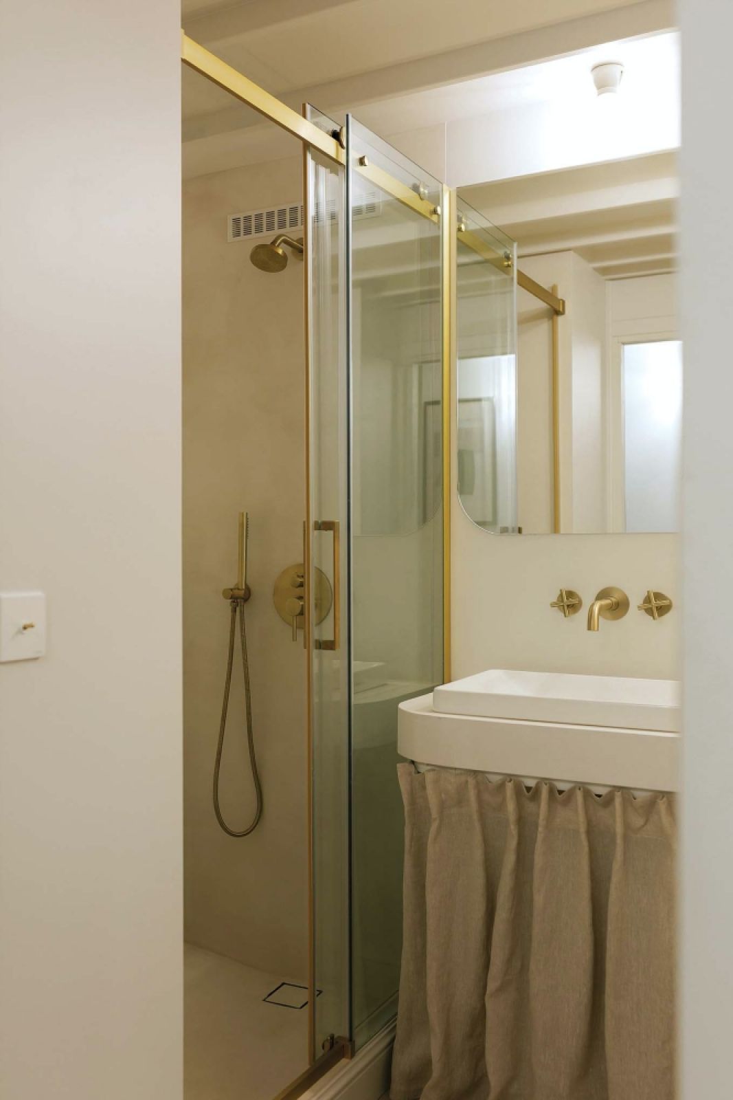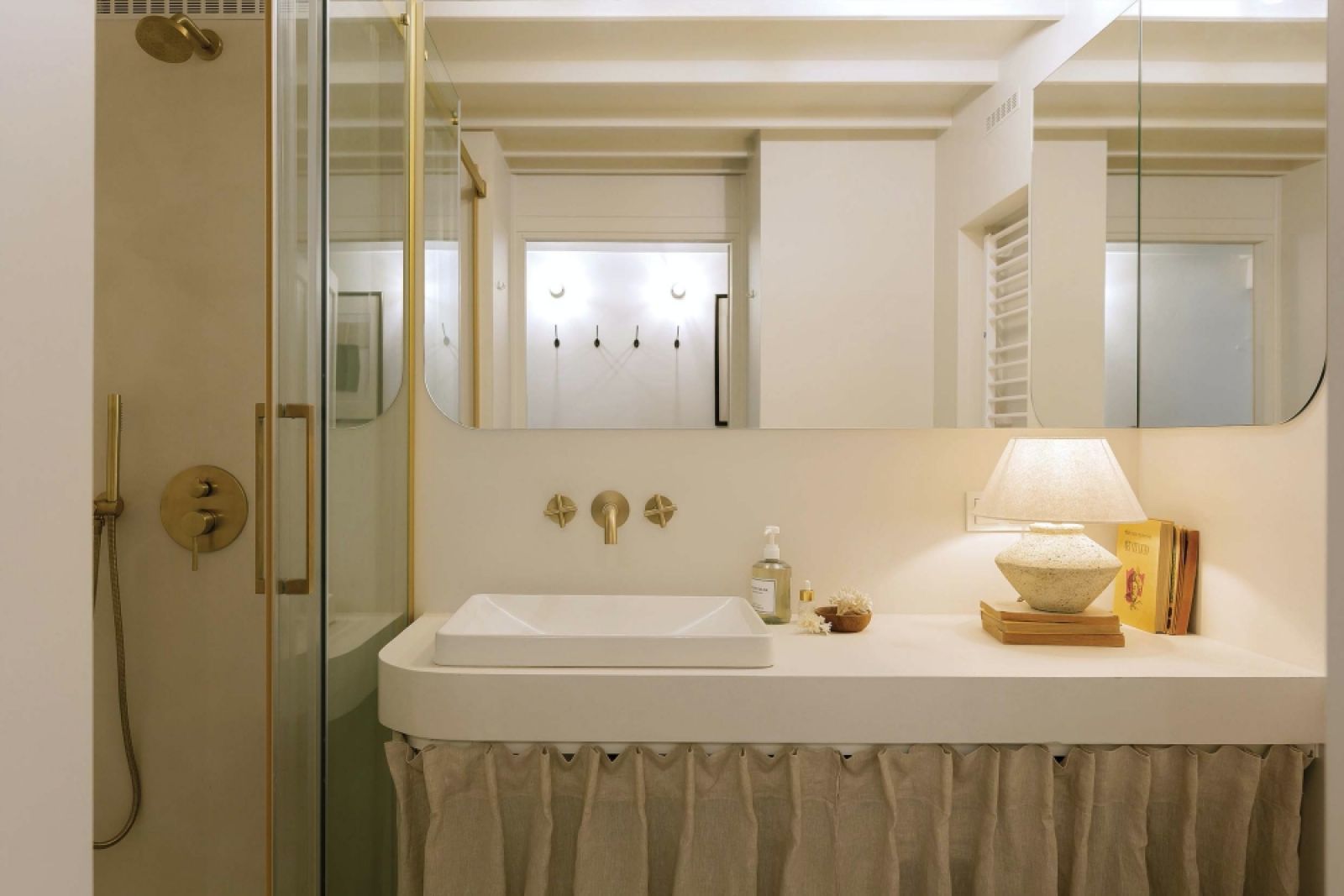 Zamiast szafki pod umywalkę zrobiono blat z mikrocementu. Pod blatem za zasłonką ukryto nietypowych rozmiarów pralkę (niższą niż standardowe). Baterie z krzyżykowymi gałkami wybrano, bo dodają wnętrzom szyku i są proste w obsłudze – to cenne w wynajmowanych lokalach.