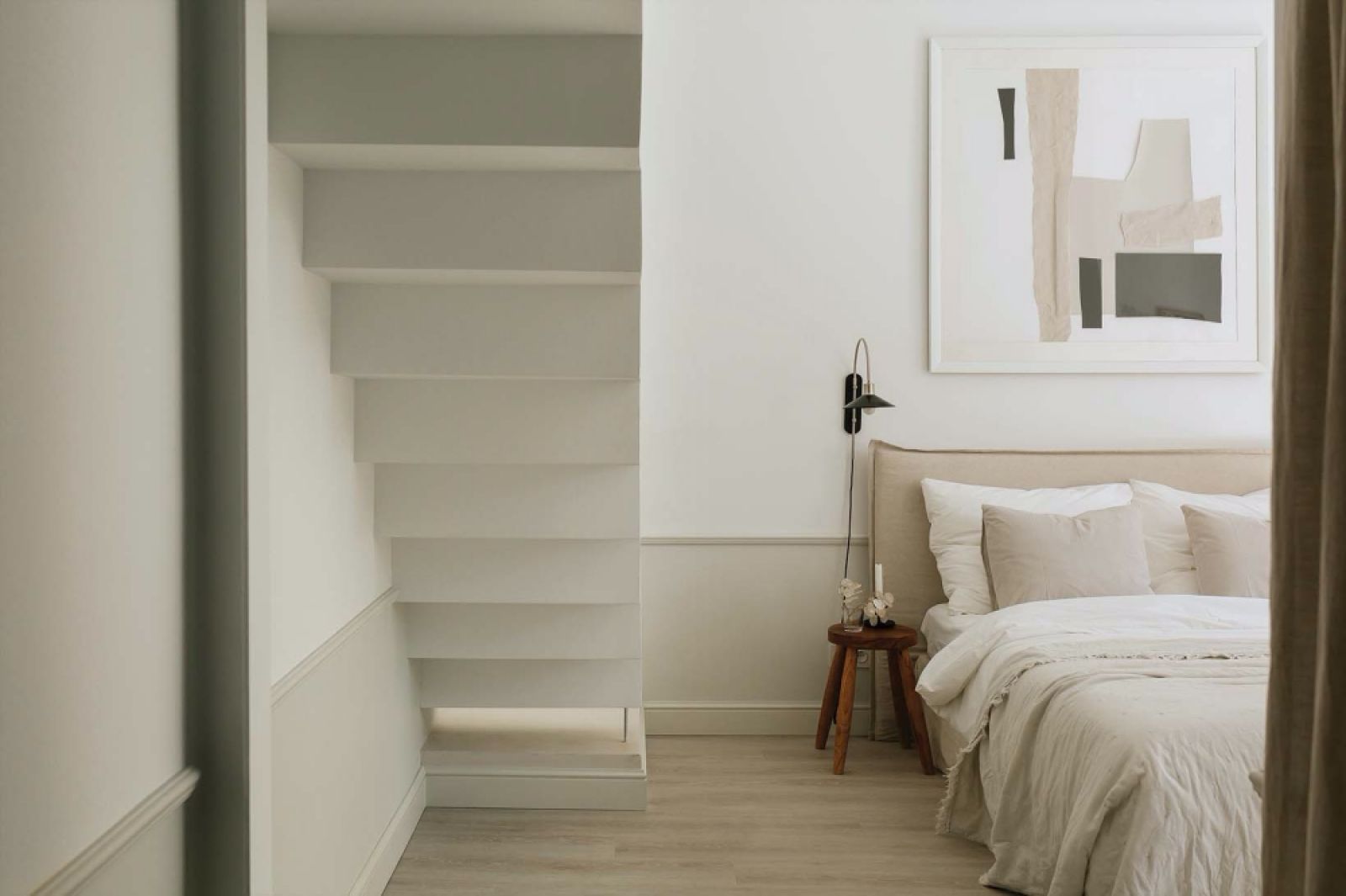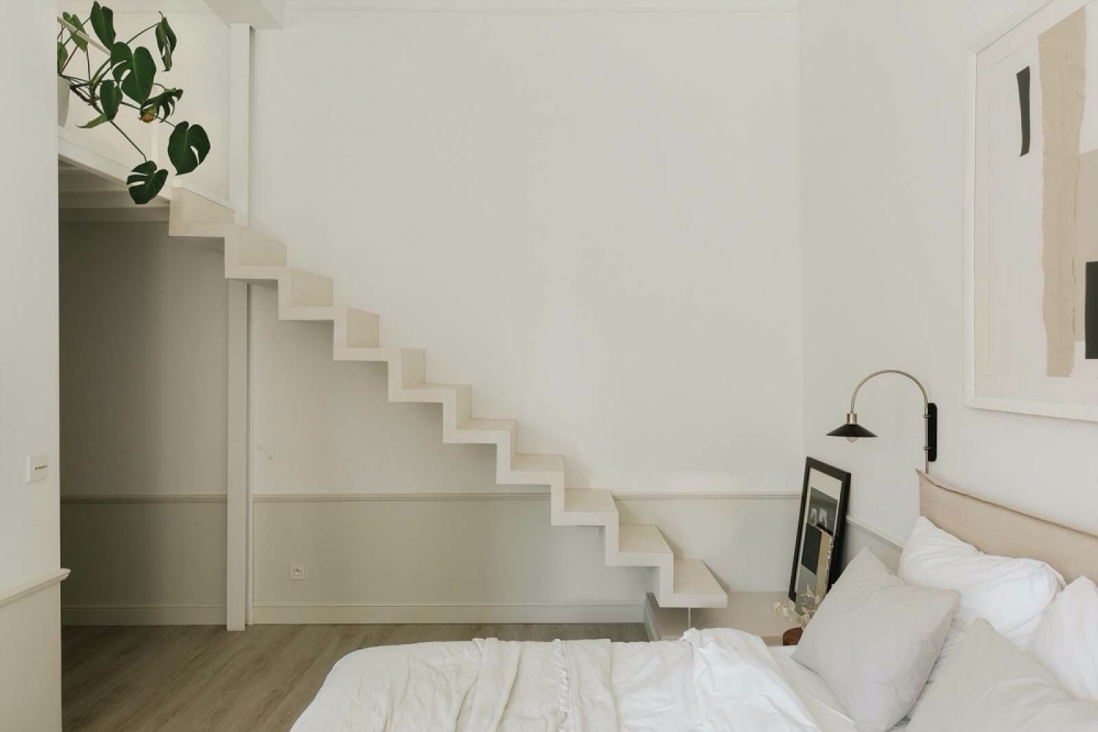 Wykorzystaliśmy wysokość mieszkania – 3,5 metra, by stworzyć dodatkowe miejsce do spania. Właścicielce zależało, żeby wejście na nią było wygodne, a nie strome czy po drabinie. Toczyłyśmy na ten temat długie dyskusje, bo jednak schody zabierają sporo miejsca. Te są więc niezbyt szerokie i bez poręczy.