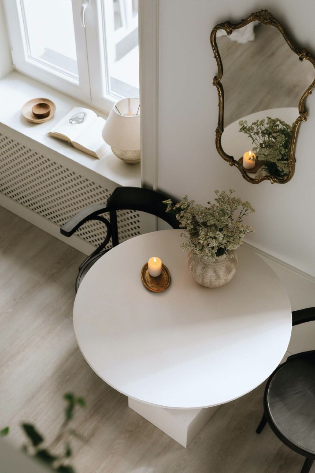 Dzięki rozmaitym detalom, takim jak sztukaterie, wyszperany piękny żyrandol czy lustro z pchlego targu. Na ścianie wisi dzieło sztuki. To sprawia, że goście mogą poczuć się jak u siebie.
