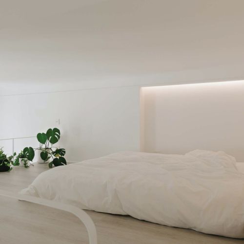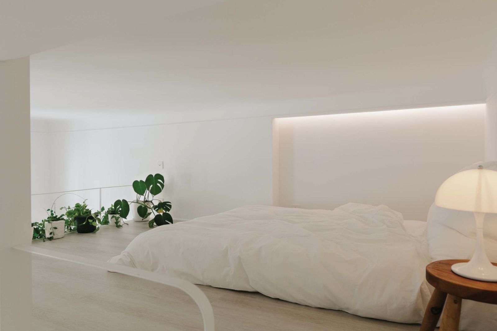 Sypialnia na antresoli ma 135 cm wysokości. Pomalowana jest na biały kolor, który zaciera jej granice, dzięki czemu wydaje się bardziej przestronna. W zagłębieniu ściany zamontowano ledowe oświetlenie – w tak niskim pomieszczeniu żyrandol (nawet najmniejszy) by się nie sprawdził. Tonącą w bieli sypialnię ożywiają i ocieplają dwa akcenty: drewniany stołek, który pełni rolę nocnego stolika – łatwy do przesunięcia podczas sprzątania – oraz zieleń w doniczkach umieszczona wzdłuż barierki.