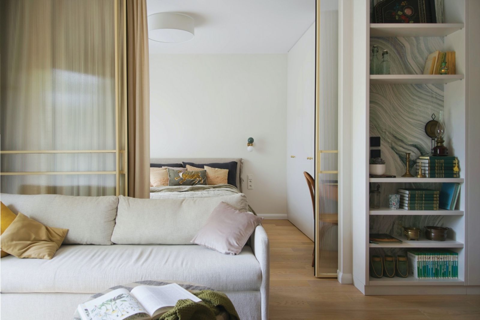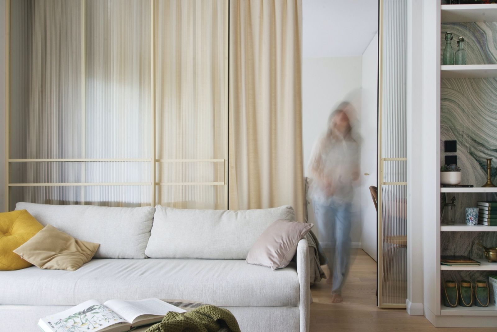 W miejscu wyburzonej ściany pomiędzy salonem a sypialnią wstawione zostały na całej wysokości przesuwne drzwi z ryflowanego szkła.
