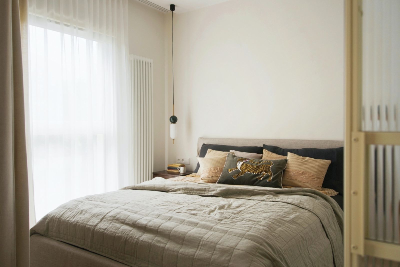 Nie całkiem, to szkło ryflowane – nawet przy odsłoniętych zasłonach widok na sypialnię jest lekko rozmyty. Takie szkło jest bardzo praktyczne – nie widać na nim odcisków palców. Nie trzeba więc codziennie przecierać tafli.