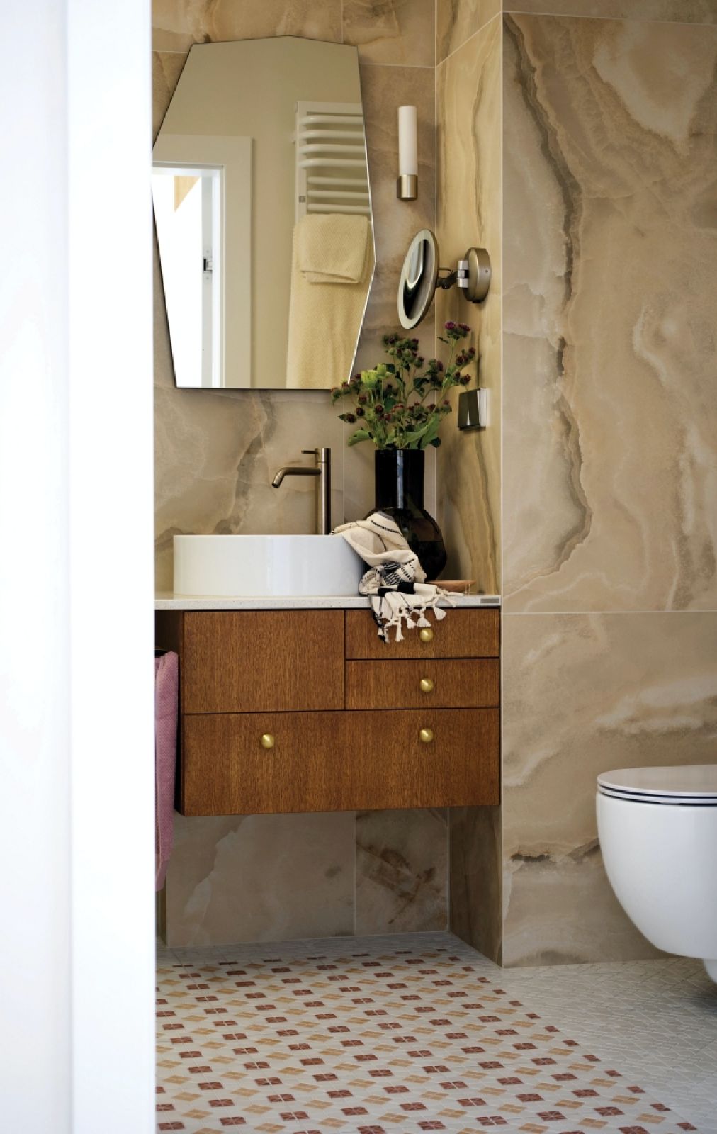 Nieregularny, ciepły wzór płytki naśladującej onyks, nawiązujący do zielonej tapety à la kamień w sypialni, został tu zestawiony z wyrazistą mozaiką na podłodze i kanciastym kształtem lustra. Całość dopełnia geometryczna podumywalkowa szafka z rzędem mosiężnych guzików. Estetyka łączy się z funkcjonalnością i starannie zaprojektowanym oświetleniem.