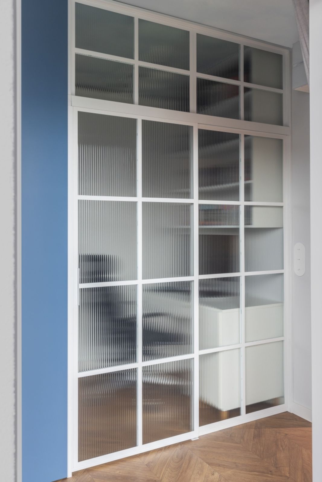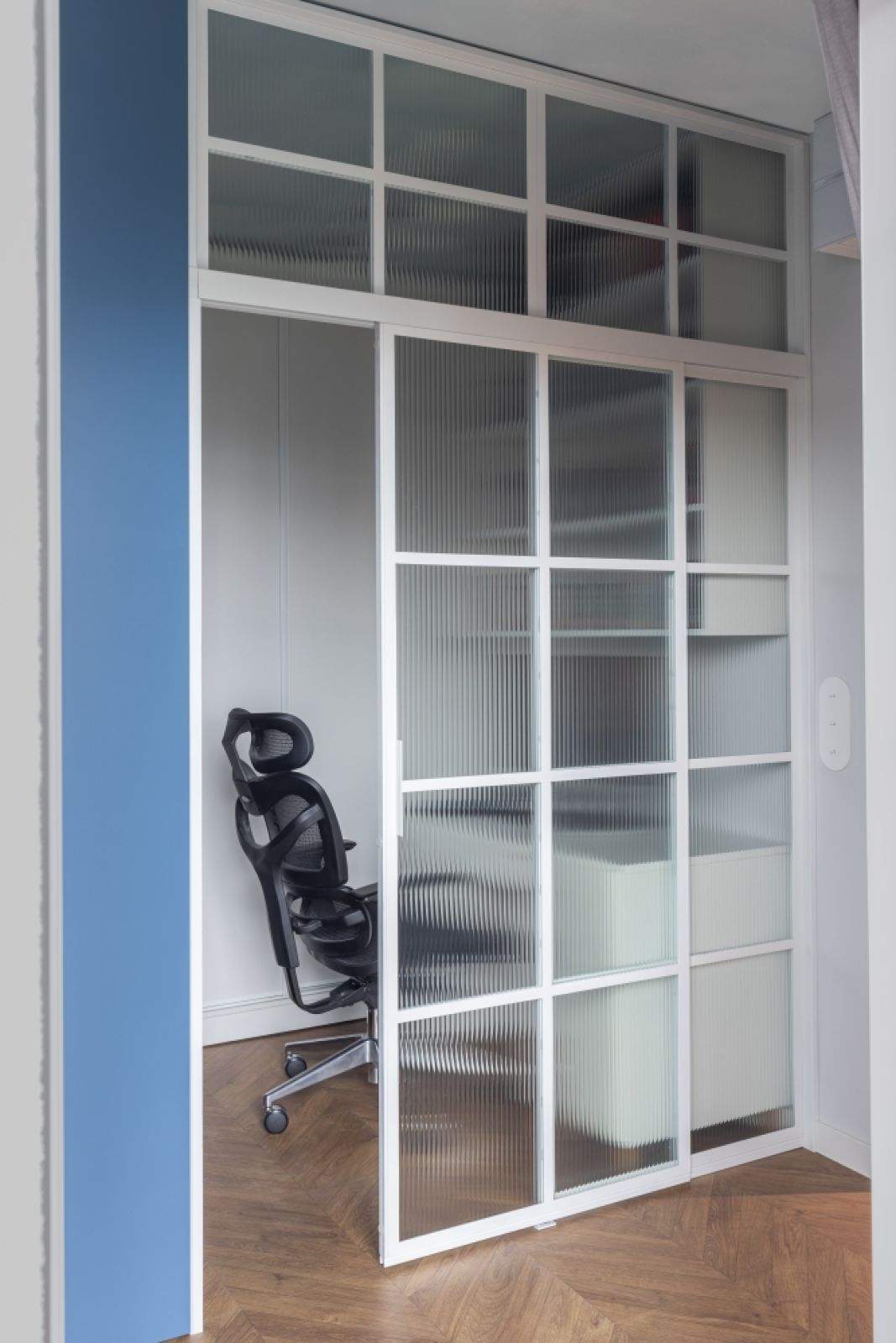 Z przestrzeni sypialni wydzielony został pokój do pracy, de facto służący do gier. Deweloper w tym miejscu przewidział wstawiany we wnękę tapczanik, ale nie było takiej potrzeby. Żeby nie robić małej klaustrofobicznej przestrzeni, w pokoiku tym zastosowałam przesuwne szklane drzwi – nie całkiem przezierne, bo szkło jest ryflowane i mrożone.