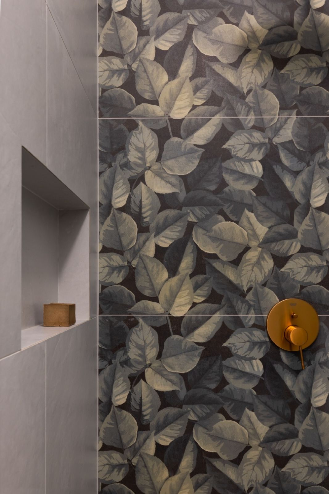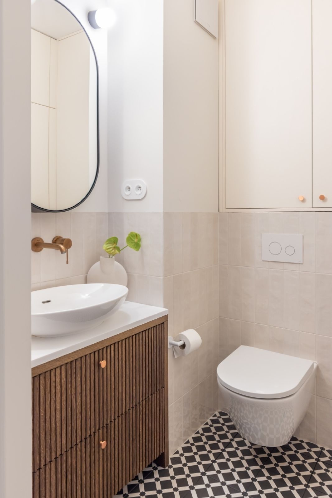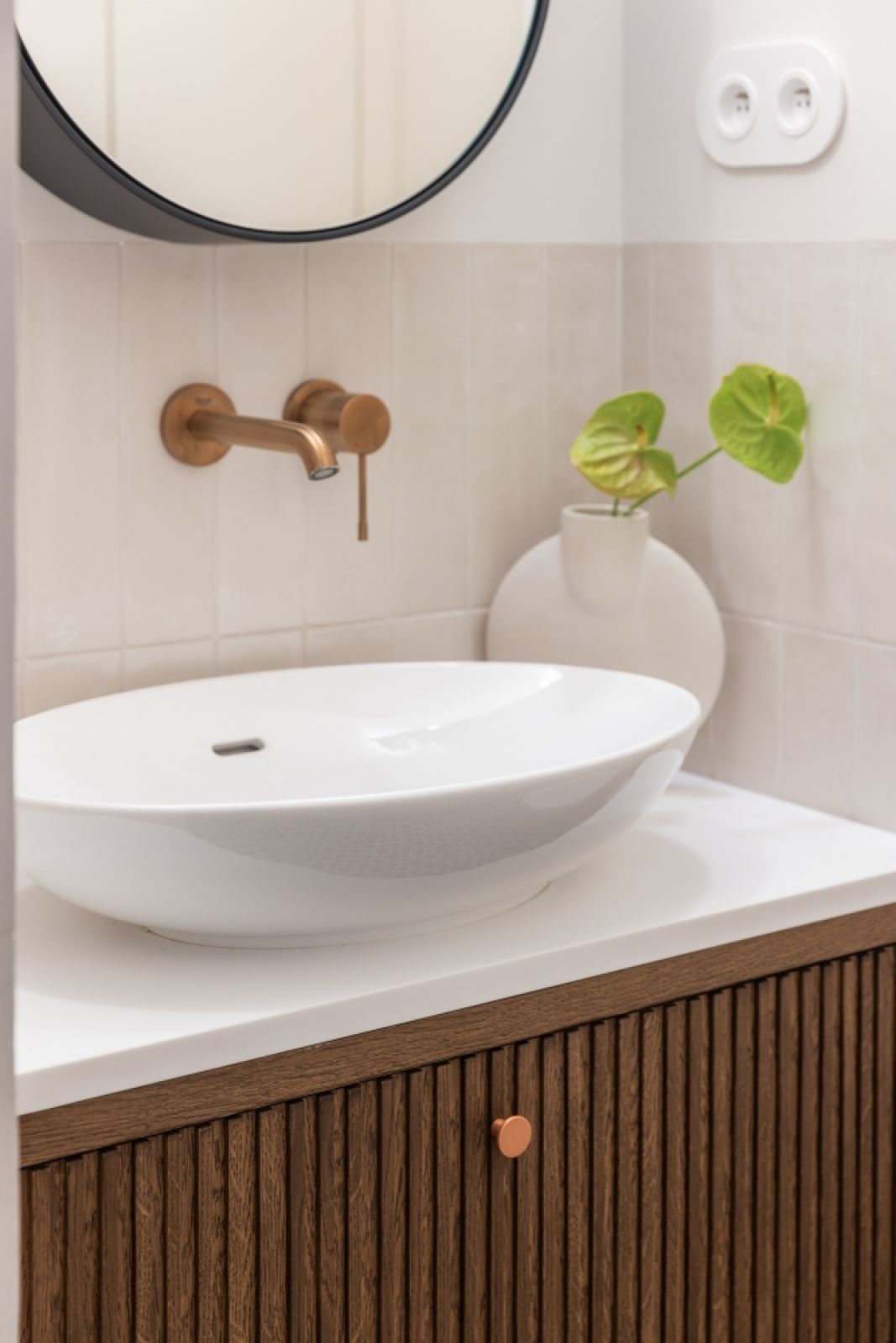 Właściciele nie chcieli mieć zwykłych chromowanych baterii – wybrali odcień szczotkowanej miedzi. W tym samym kolorze są też inne detale, takie jak gałki mebli. Świetnie grają z zielenią w odcieniu sukulentów na frontach. Na podłodze, dla ożywienia wnętrza, ułożone zostały efektowne płytki z motywem lastriko o dużych, nieregularnych „odłamkach”.