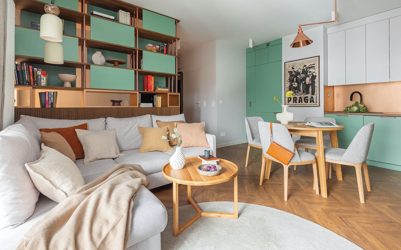 Mieszkanie 53 m2 urządzone w zieleni i błękicie – pomysłowe wnętrze z dwustronnym regałem i tapetą na suficie w sypialni