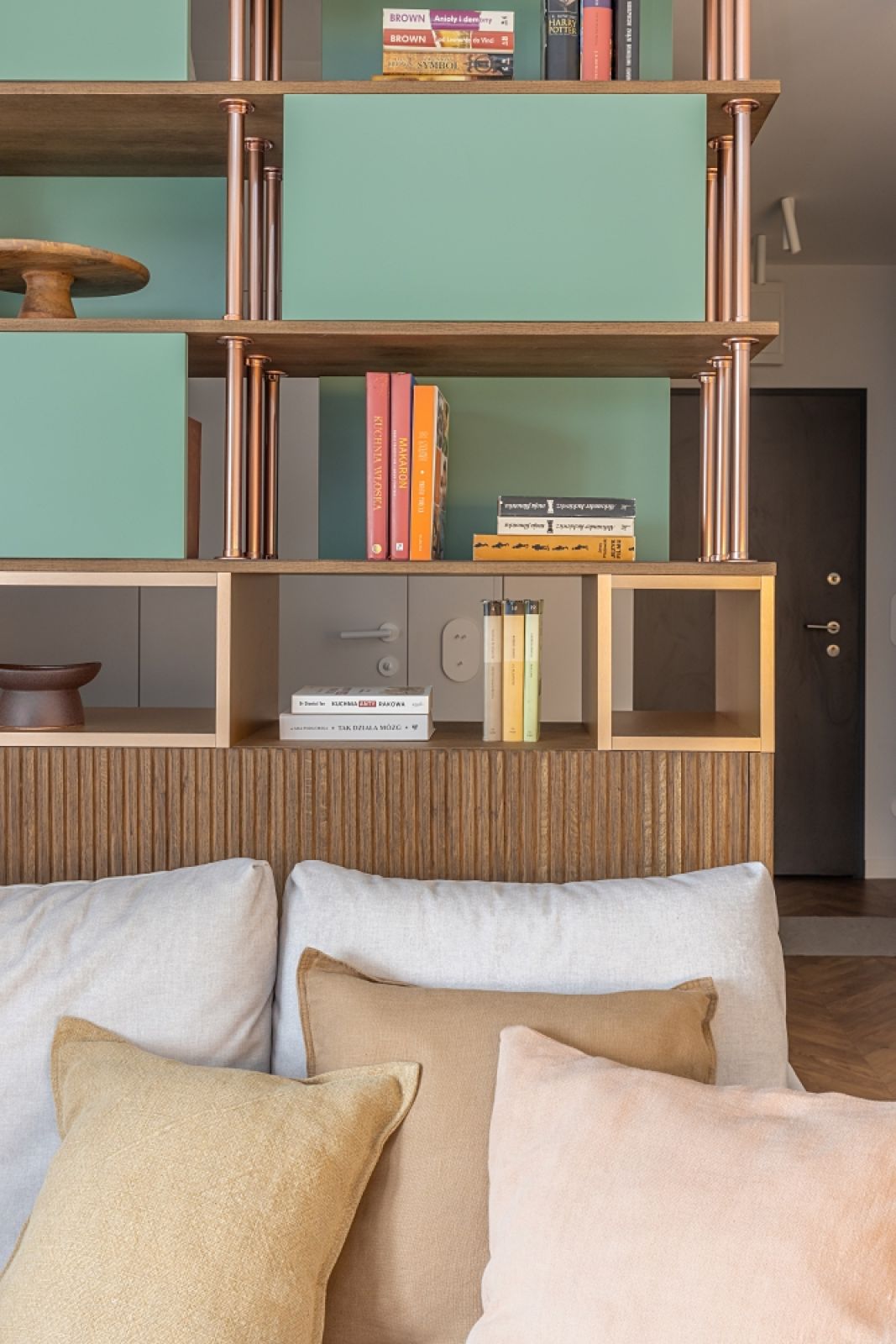 Specjalnie zaprojektowany dwustronny regał z zielonymi plecami naprzemiennych (otwartych i zamkniętych) półek ożywia wnętrze i wpuszcza nieco światła do holu.