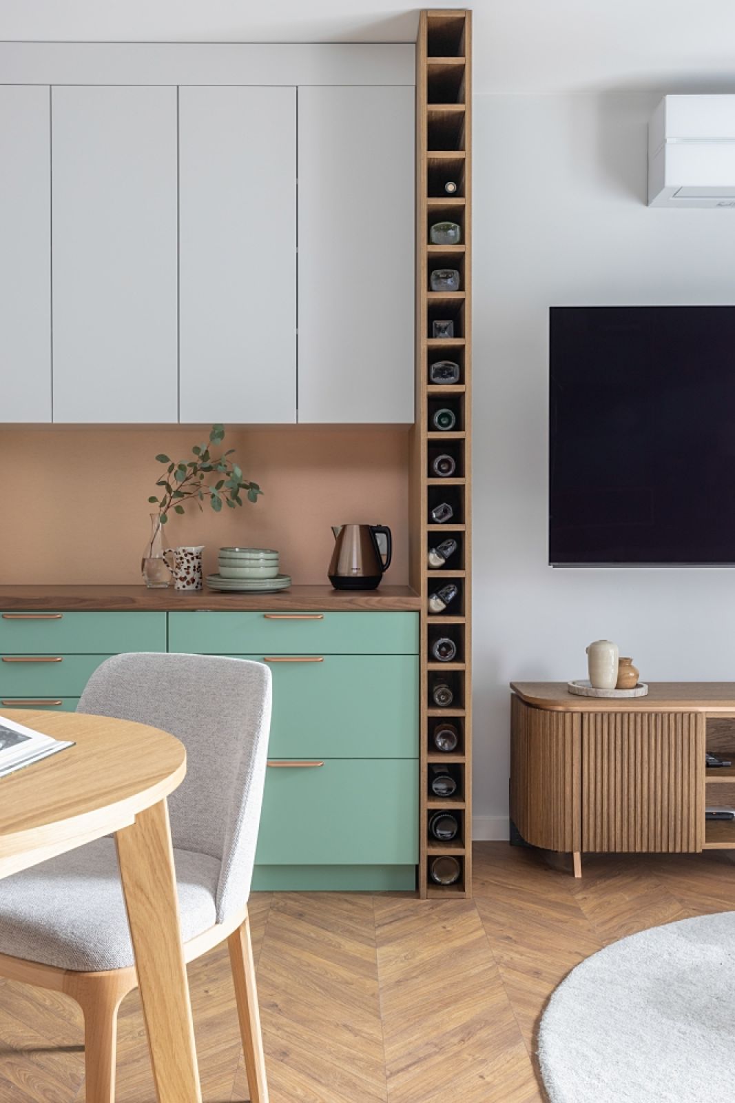 Wąska i pnąca się do samego sufitu półka to oryginalny sposób na przechowywanie butelek wina. Wyznacza też symbolicznie granicę między salonem a kuchnią.