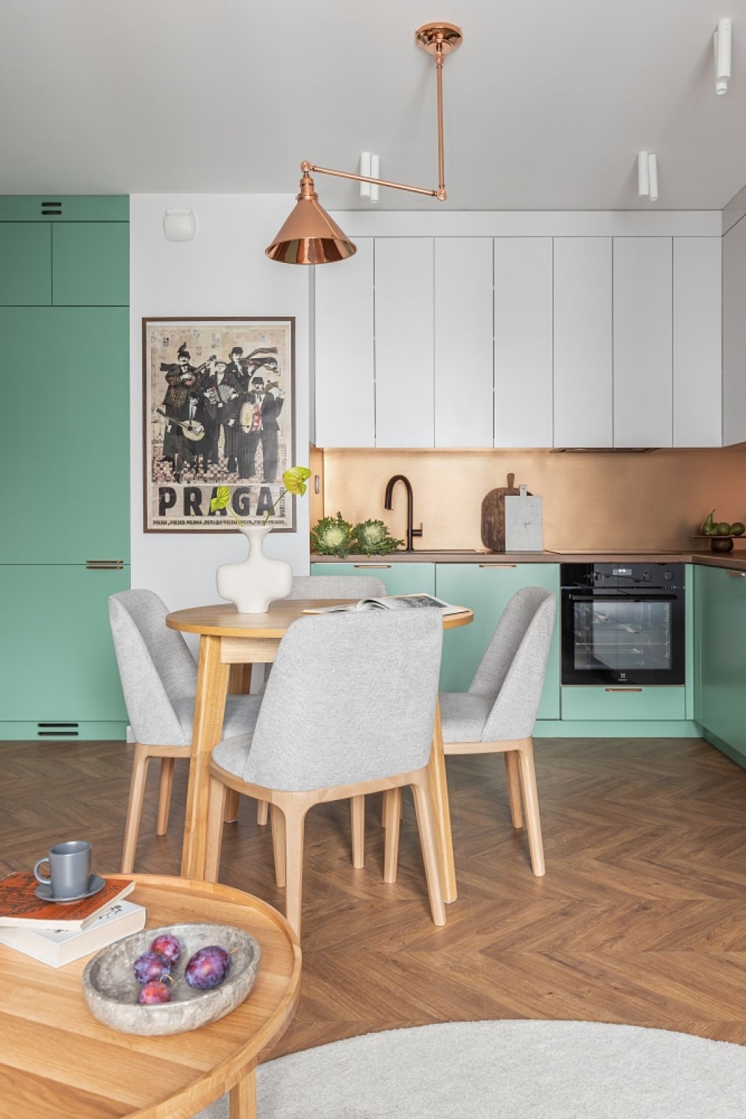 Akcenty miedzi (materiału i koloru) przewijają się w całym mieszkaniu. W kuchni jest to lampa wisząca oraz laminat zastosowany na ścianie nad blatem. Rozległa zabudowa kryje m.in. niestandardową lodówkę (o szerokości 70 cm) i wysokie cargo z koszami w środku, gdzie można przechowywać zapasy.