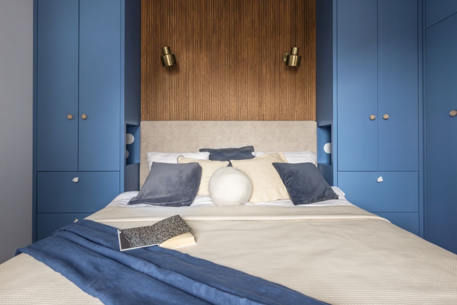 Flankujące łóżko szafy zapewniają dużą ilość miejsca do przechowywania w sypialni. Rolę stolików nocnych pełnią zaprojektowane w szafach schowki – na telefon, kubek kawy czy książkę.