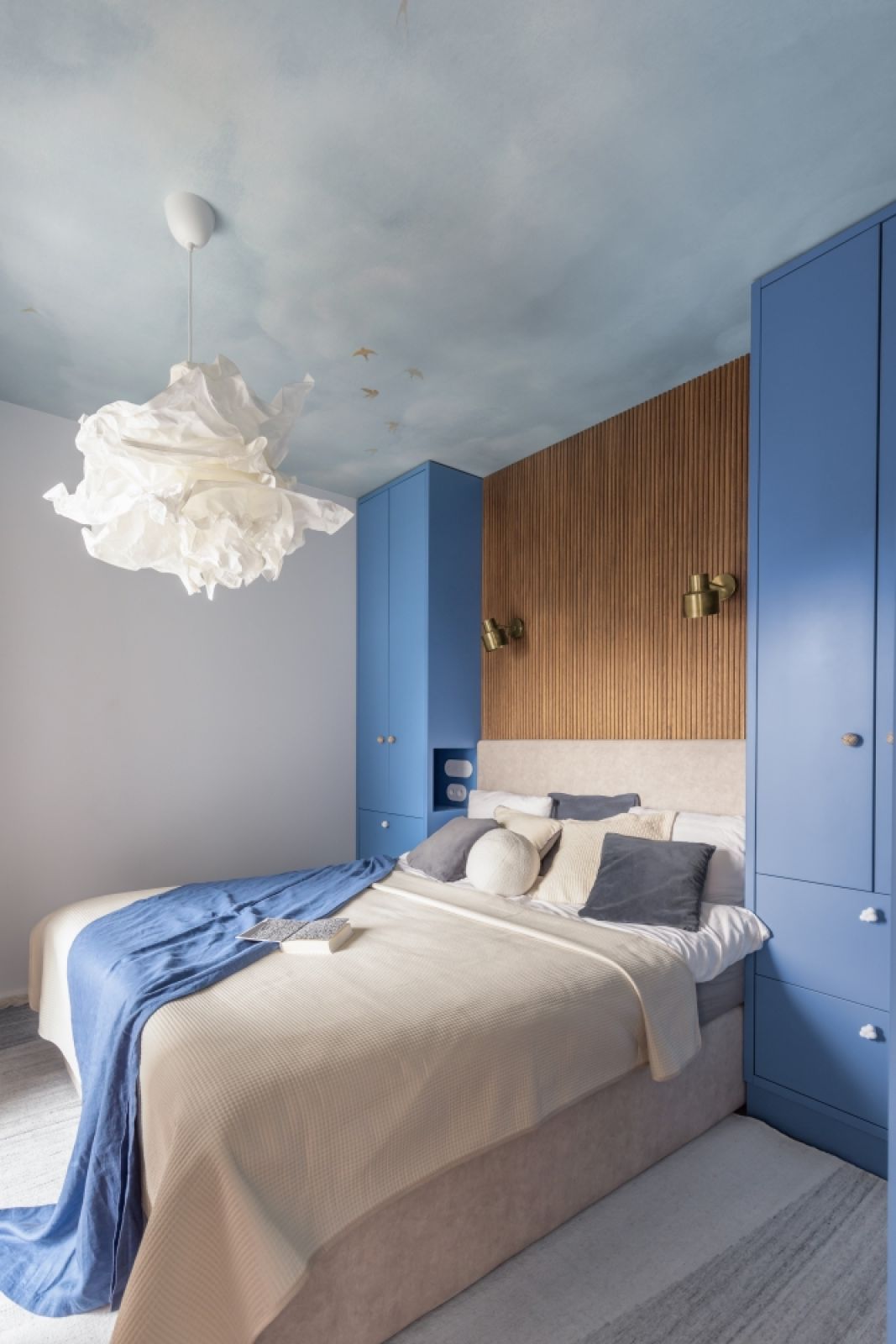 Tapeta z motywem nieba chodziła mi po głowie od dawna i to jest coś, co wprowadziłabym także u siebie w domu. To pomysł zaczerpnięty z moich osobistych inspiracji i fascynacji wnętrzami klasycznymi, włoskimi, także sakralnymi. W tym wypadku szukałam tapety, która połączy wizualnie błękitne fronty zabudowy z bielą ścian. Znalazłam taką, która wygląda jak namalowany fresk. Nie dość, że po wejściu do sypialni od razu przyciąga wzrok, to uprzyjemnia pobudkę – otwieramy oczy, a nad nami niebo!