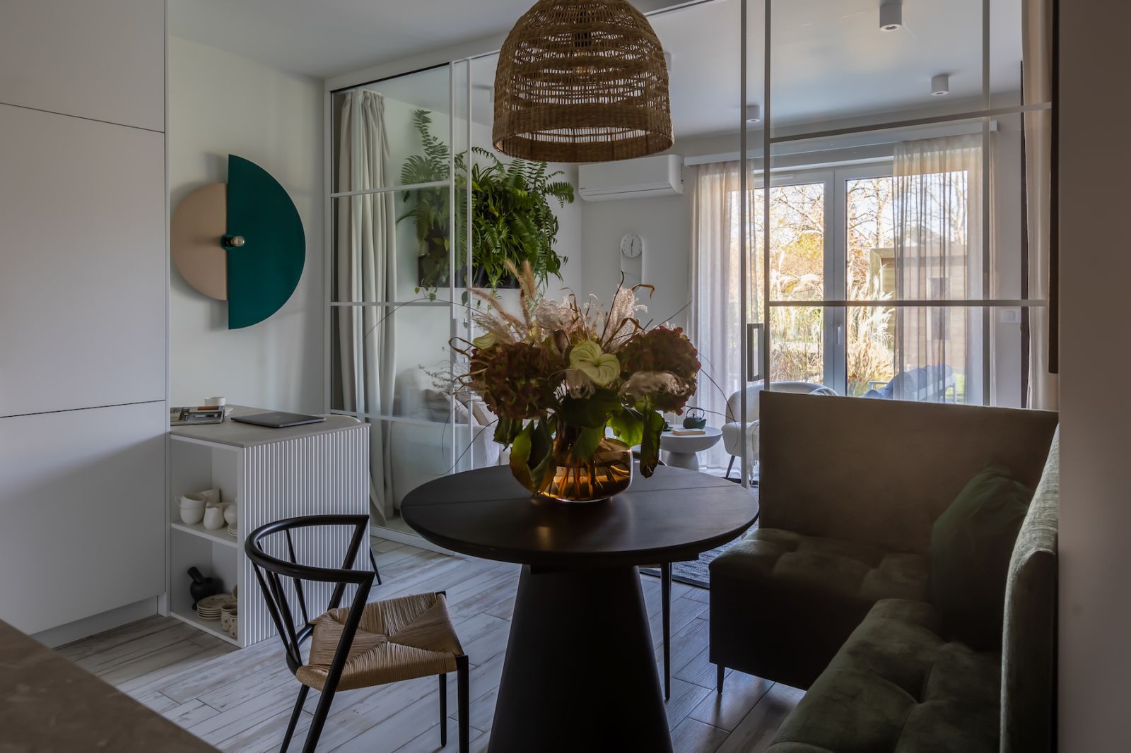 Kiedy ma się już samodzielne dzieci w wieku nastoletnim i pracuje zdalnie, codzienne bywanie w mieście nie jest koniecznością a przyjemnością. Z takiego założenia wychodziła właścicielka tego mieszkania szukając przestrzeni do życia dla swojej trzyosobowej rodziny i czworonożnego pupila. Wybrała niewielkie miasteczko pod Krakowem, bliskie jej emocjonalnie. Cisza i spokój zdecydowanie wygrywają tu z turystycznym gwarem, a zieleń za oknami i świeże powietrze dają odprężenie wszystkim zmysłom. Tu po prostu żyje się wolniej, spokojniej, bardziej na luzie.