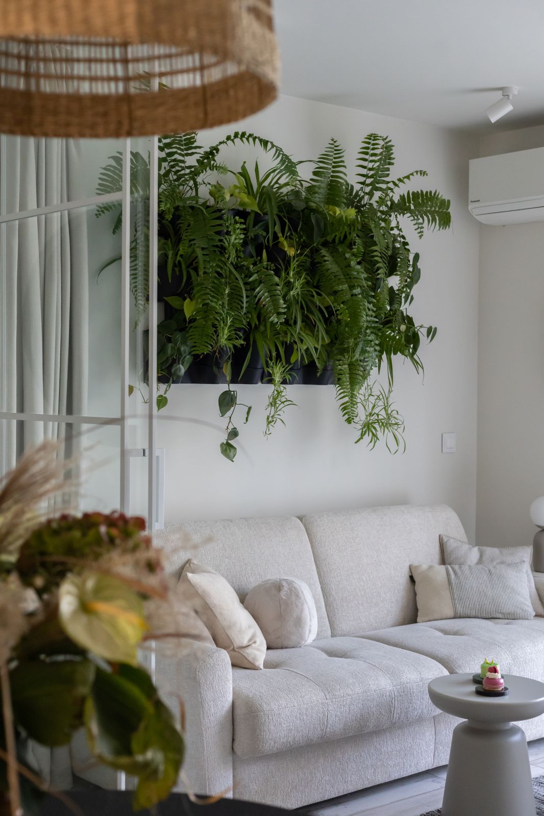 Projektantka znalazła nawet prosty i efektowny sposób na rośliny – hobby właścicielki: zaaranżowała zieloną ścianę nad sofą, która fantastycznie ożywiła przestrzeń i wprowadziła naturalną świeżość.