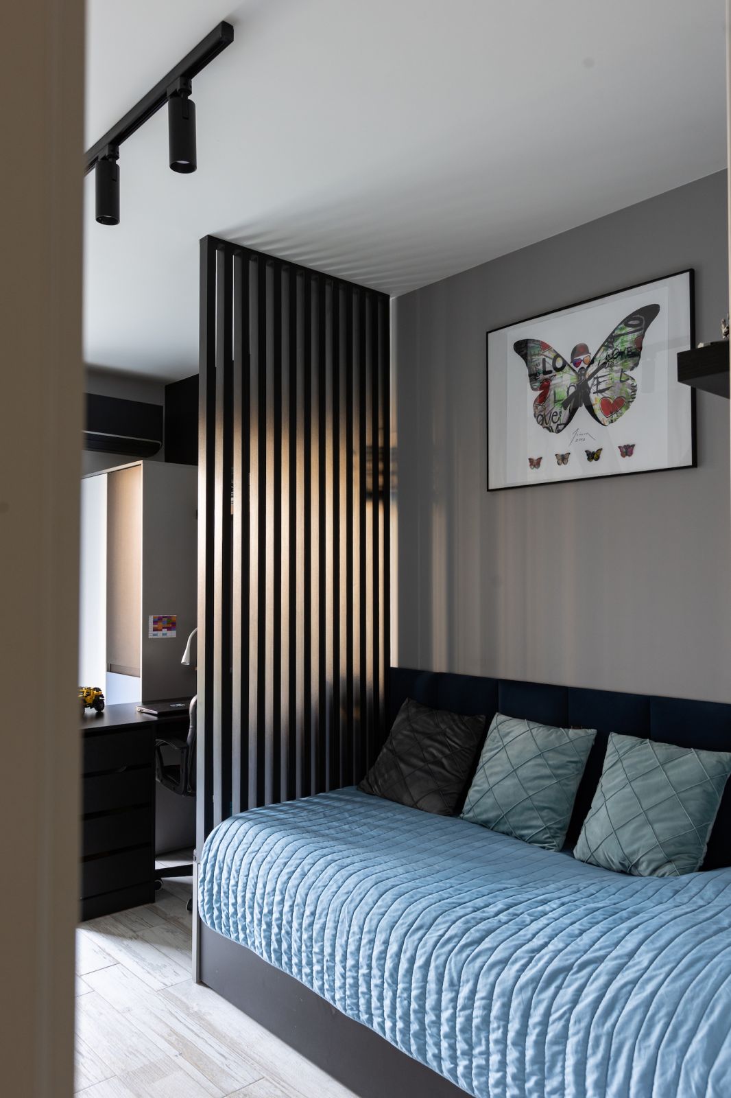 Najtrudniejszym zadaniem było znalezienie miejsca dla samej właścicielki – nie tylko do spania, ale też do wyciszenia. Trzecia sypialnia nie wchodziła w grę przy takim metrażu, ale projektantka zaproponowała oddzielenie kuchni od salonu przeszkloną otwieraną ścianą. Nie zabiera miejsca i światła tyle co tradycyjna działowa, a jednak jest i funkcjonalnie dzieli przestrzeń.
