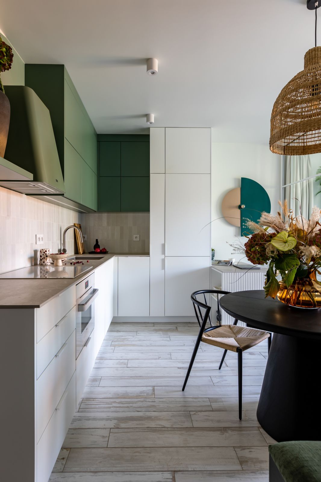 Aneks kuchenny otwiera się na salon, sprawiając wrażenie całkiem sporego. Projektantka pomysłowo ograła go kolorystycznie – dolne szafki zaprojektowała w neutralnej, lekkiej optycznie bieli i zestawiła je z zieloną górą nawiązującą do stylu farmhouse. Meble rozdziela pas szkliwionych płytek-cegiełek nad blatem, które fantastycznie rozświetlają wnętrze. Ciekawym detalem jest łuczek na ścianie przy okapie, którym Anita wykończyła górny ciąg. Zamiast szafki zaprojektowała nad nim półeczkę, na której właścicielka postawiła ulubiony wazon.