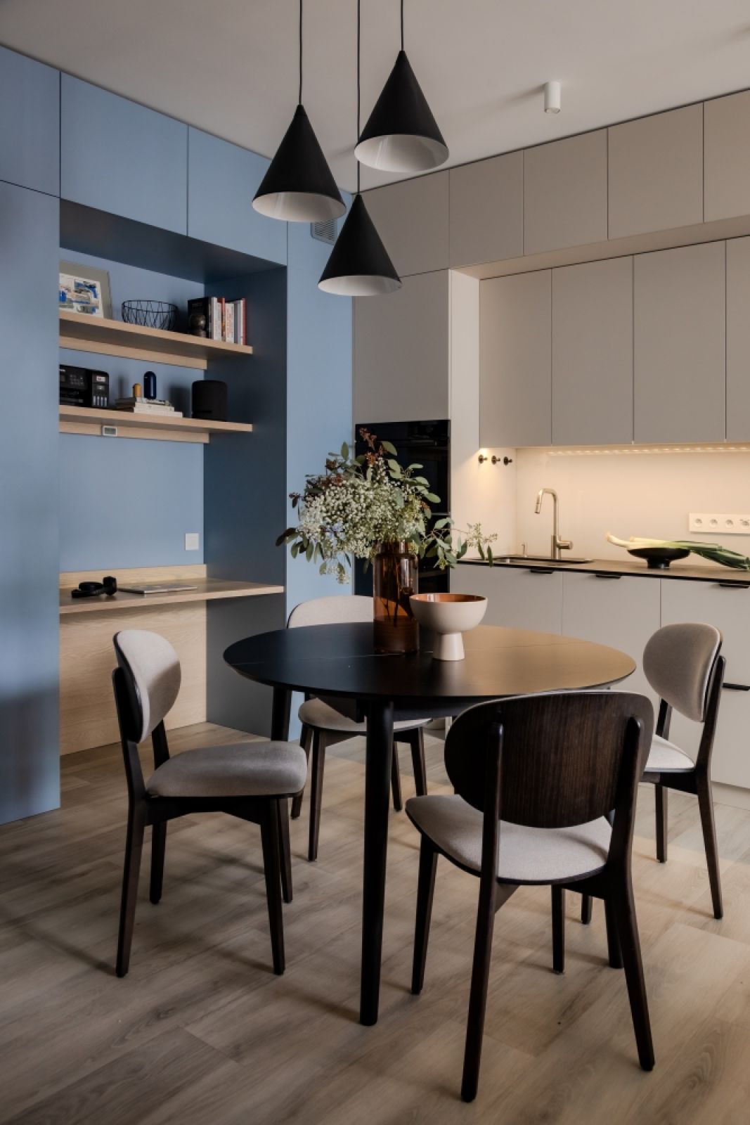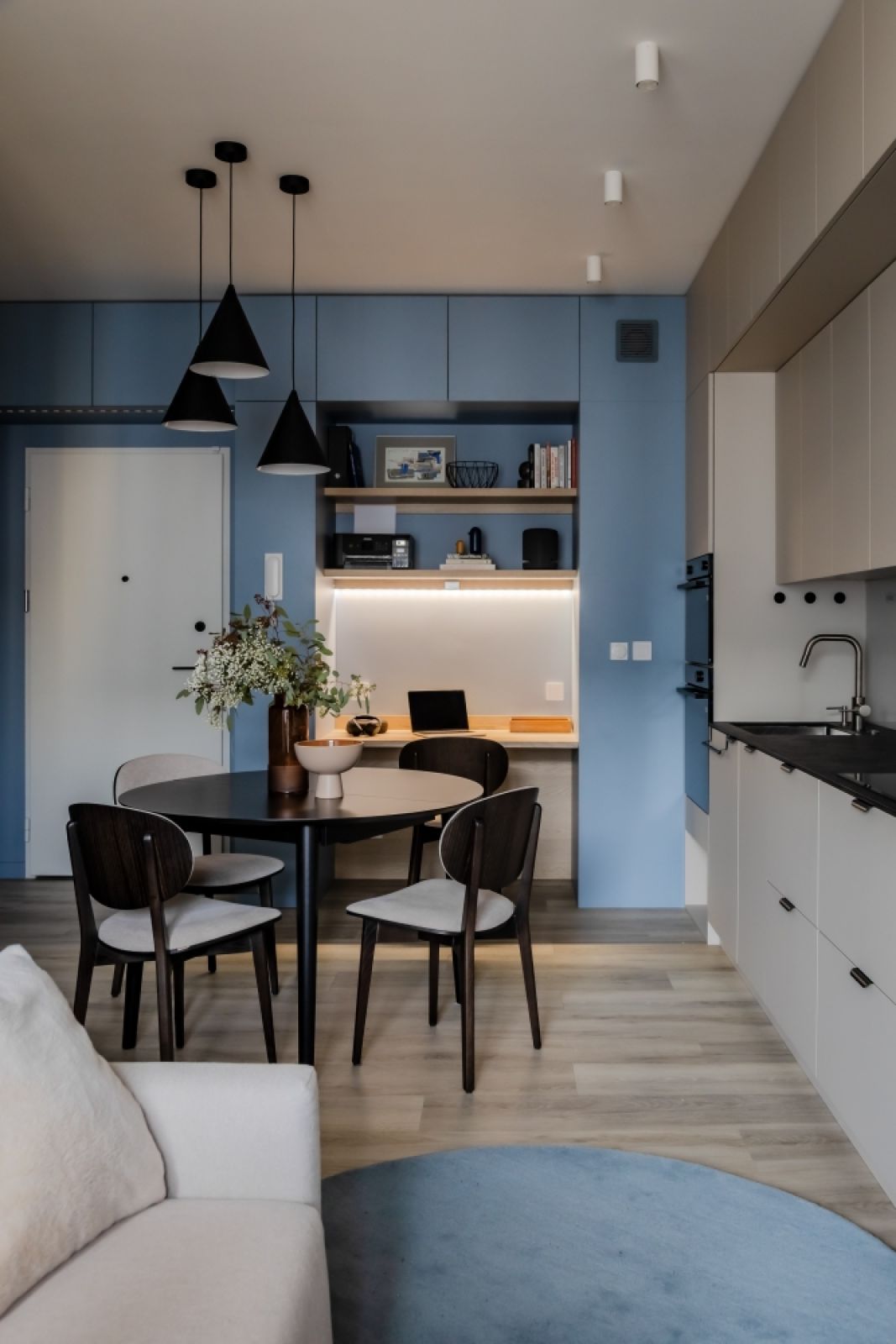 W błękitnej części jadalni zdecydowano się zaaranżować strefę do pracy. W niewielkiej niszy architekci zaproponowali miejsce na home office – małe podwieszane biureczko oraz półki na książki i podręczne akcesoria.